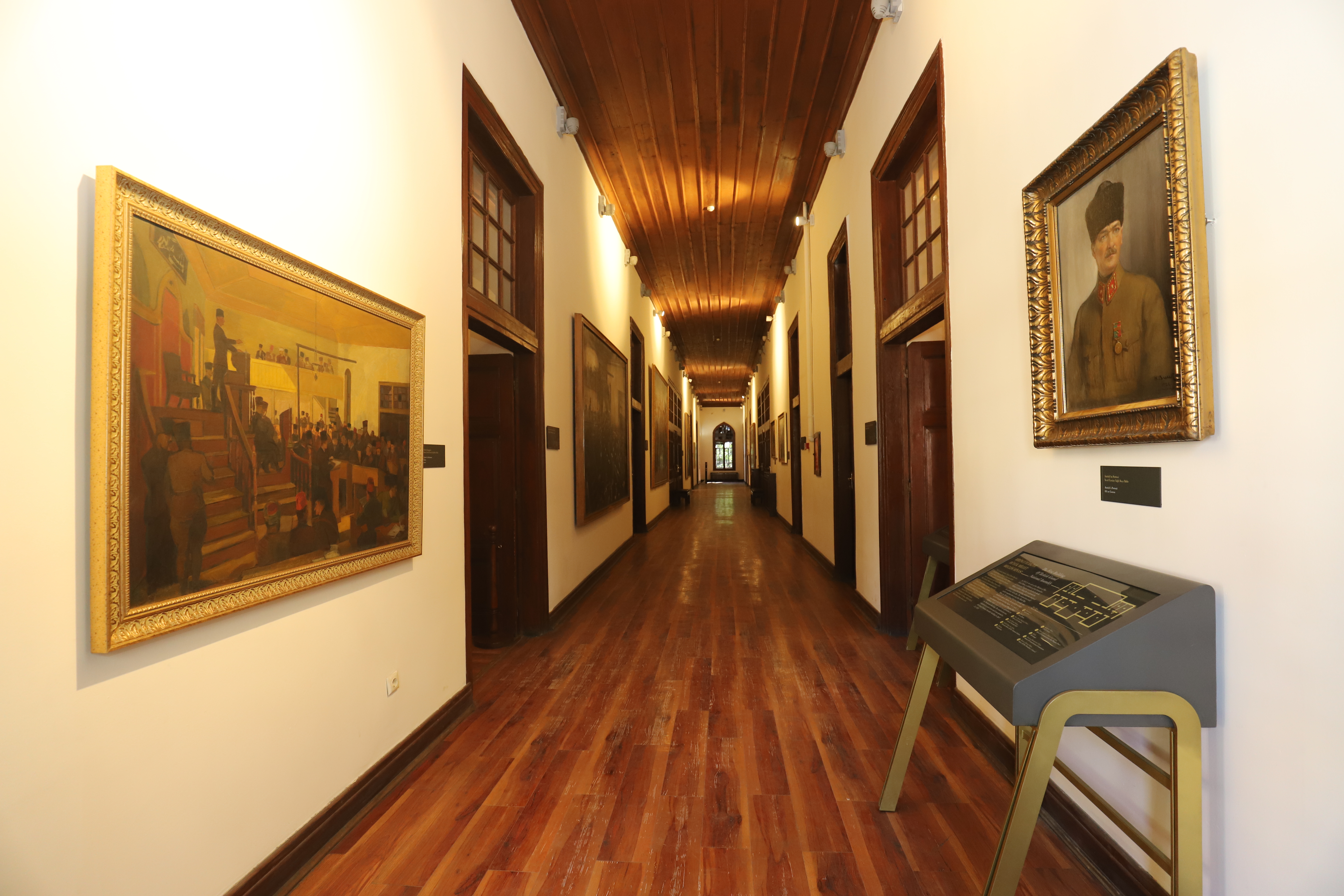 Koridorun sağ ve sol duvarlarında; Cumhuriyet Dönemi ressamlarının yağlı boya tabloları ile Genel Kurul Salonun’daki oturumu gösteren fotoğraflar sergilenmektedir.