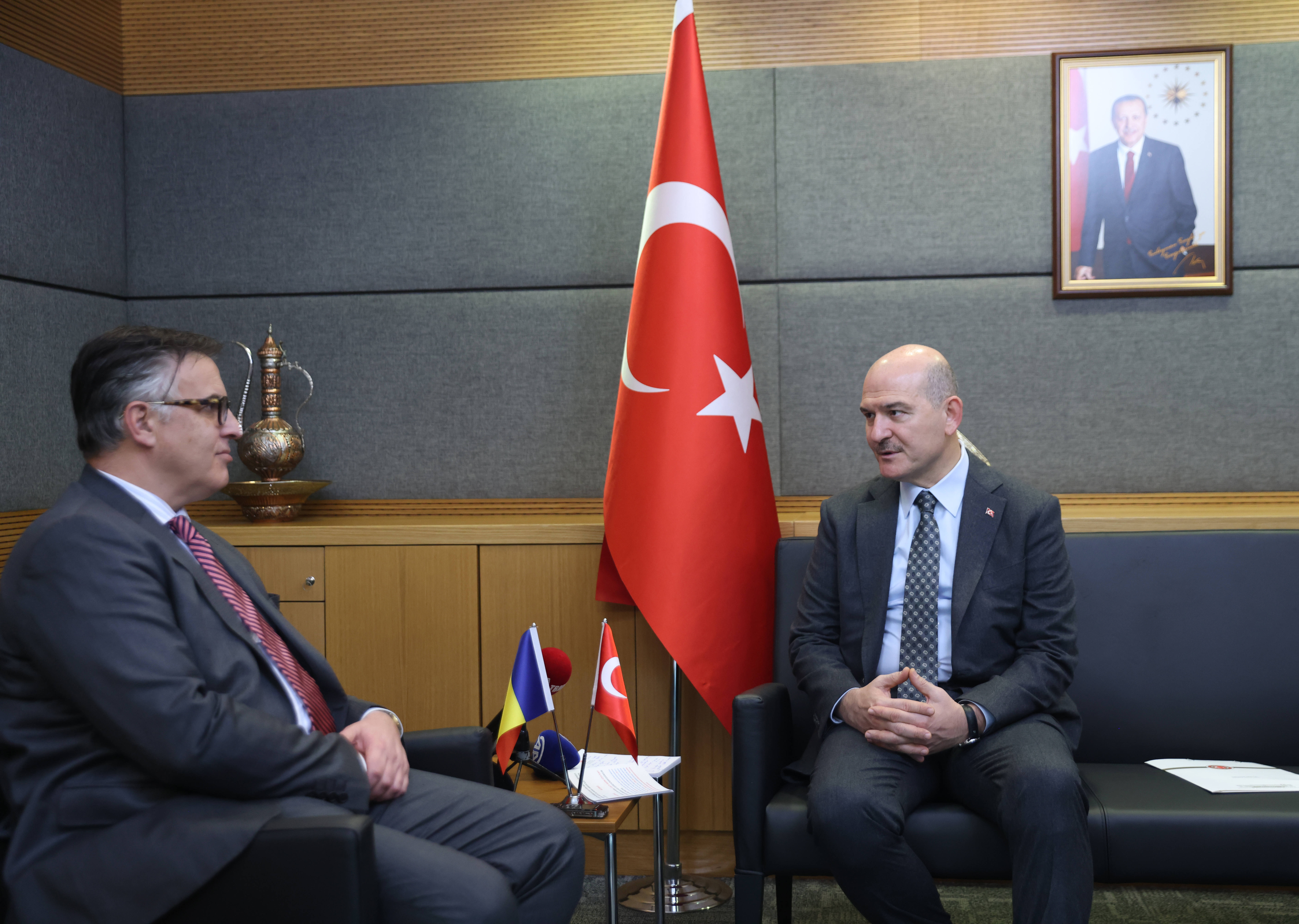 TBMM İçişleri Komisyonu Başkanı Soylu, Meclis'teki makamında Romanya Büyükelçisi Stefan Alexandru Tinca ile görüştü.