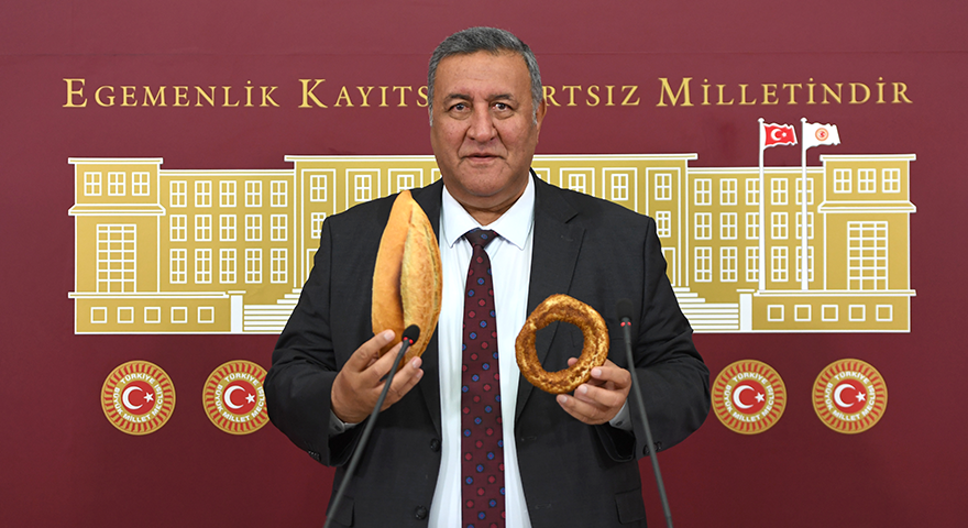 Kürsüden, ekmek ve simitleri göstererek fiyatlarını paylaşan Gürer, simidin fırında 15, Halk Ekmek'te ise 7,5 liraya ve ekmeğin de 8 liradan satıldığını belirtti.