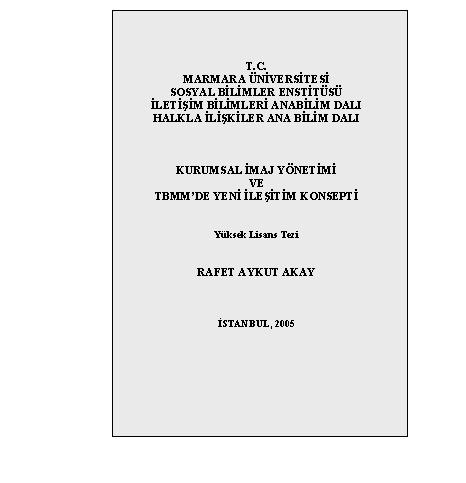 Marmara Üniversitesi Sosyal Bilimler Enstitüsü İletişim Bilimleri Anabilim Dalı için, Rafet Aykut Akay tarafından hazırlanan 'Kurumsal İmaj Yönetimi ve TBMM'de Yeni İletişim Konsepti' başlığını taşıyan tez çalışması, TBMM'nin yeni iletişim modelini anlatıyor.