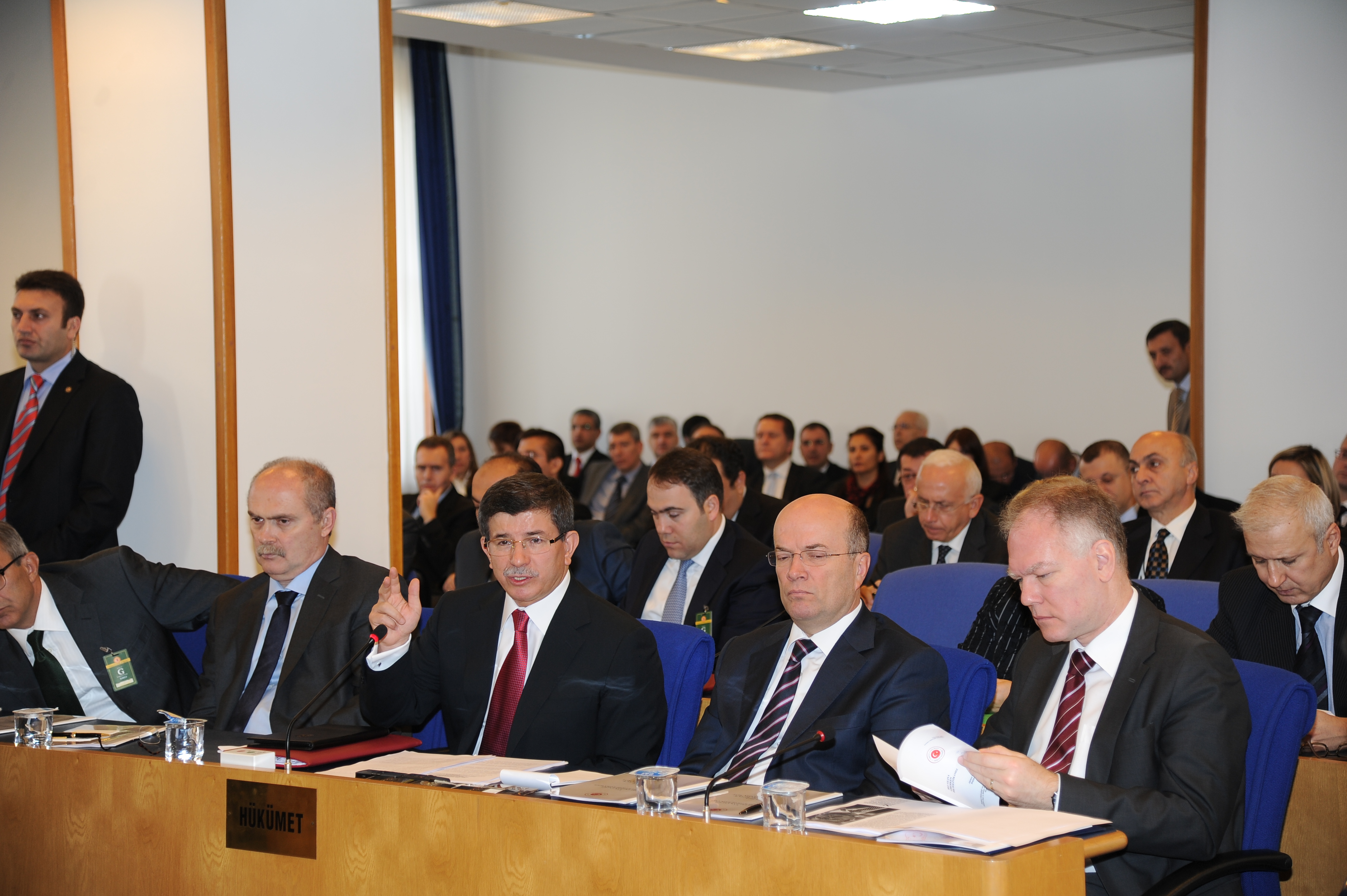 Esas başarı, sonuç ne olursa olsun, Türk halkının demokrasiye sahip çıkmasıdır. Demokrasinin ülkenin hiçbir köşesinde zaafa uğramaması en büyük hedef. İkinci nokta, ekonomimizdeki yüksek performanstır. Türkiye, bu kriz ortamı içerisinde sürekli ekonomik büyüme sağladı. Herkesin yakından takip ettiği bir ekonomik performans. Eğer güçlü bir ekonomi ile tahkim edilmezse demokrasiyi yaşatmakta zorluklar çıkar.'' Davutoğlu'nun konuşması sırasında bazı cep telefonlarının mikrofondan ses iletiminde aksamalara nedene olması üzerine, Komisyon Başkanı Lütfi Elvan, telefonların kapatılmasını istedi. Davutoğlu da ''Sayın Başkan, cep telefonlarımız sürekli açık. Çünkü her an bir kriz haberi geliyor'' dedi.