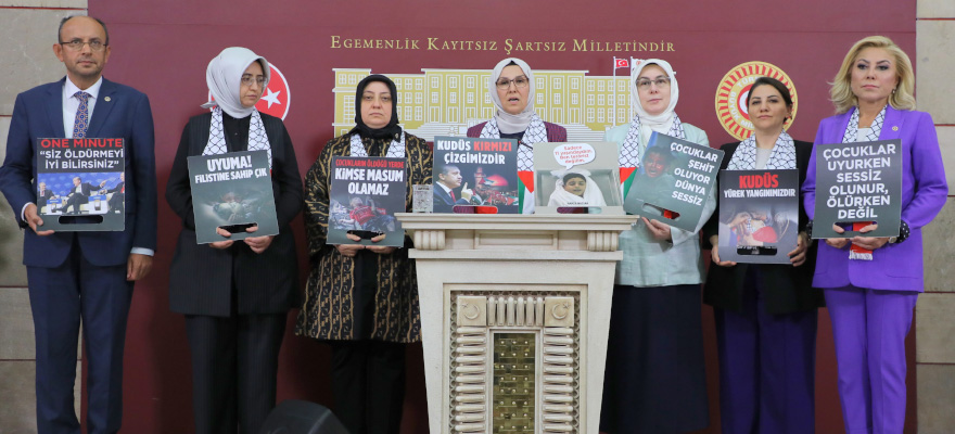 Toplantıda, milletvekillerinin boyunlarına Filistin atkısı taktıkları ve ellerinde Gazze'de yaşananları protesto eden kartlar taşıdıkları görüldü.