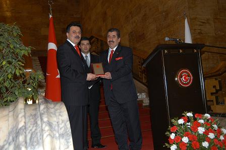 Nevzat Pakdil, Doğan Hattatoğlu'na günün anısına bir plaket verdi.