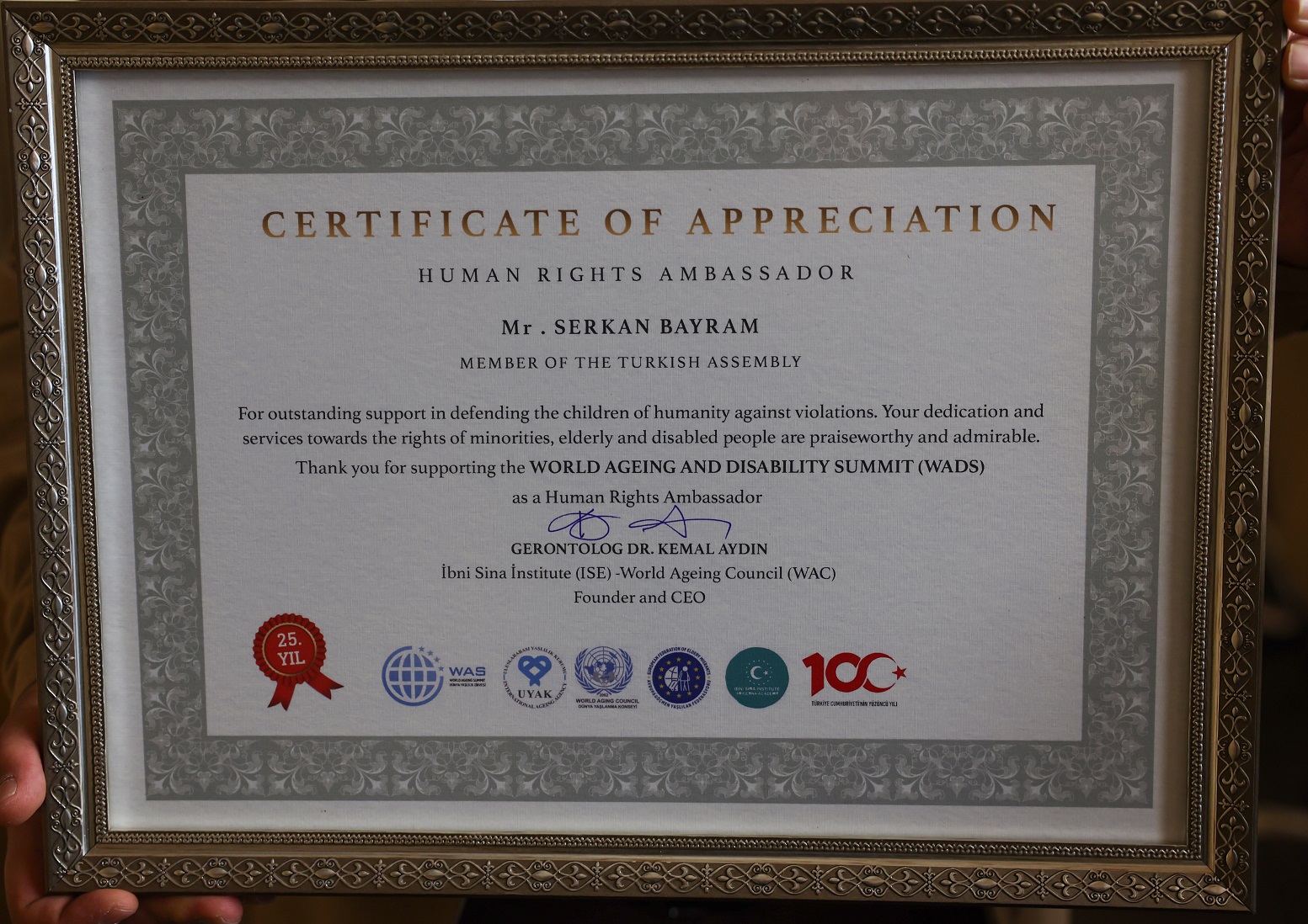 Dünya Yaşlanma Konseyi Başkanı Aydın, engelli, yaşlı ve mazlumların haklarını korumasından dolayı AK Parti İstanbul Milletvekili Bayram'a "Ömür Boyu İnsan Hakları Elçisi Beratı" takdim etti.