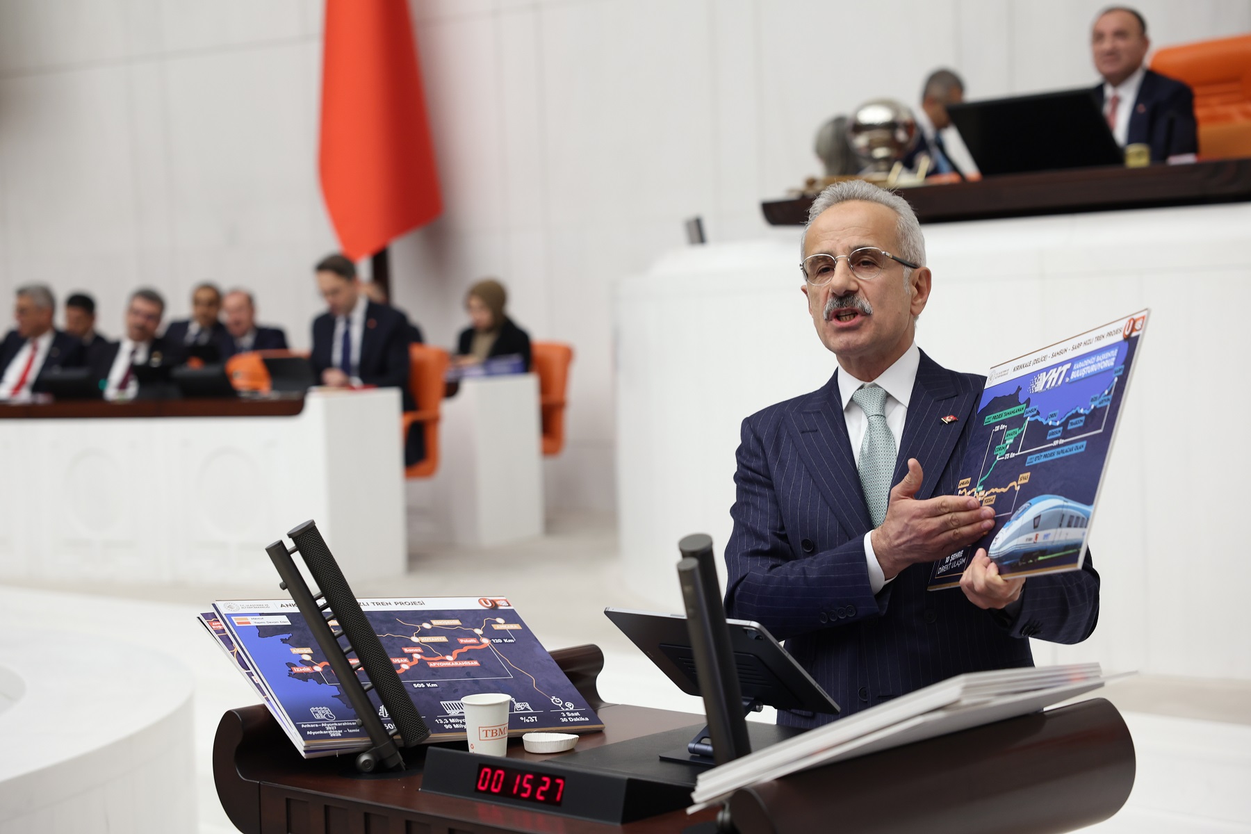 "Samsun-Sarp Hızlı Tren Projesi'nin etüt proje çalışmalarına başladık. 2028'e kadar mevcutta devam eden 3 bin 92 kilometre uzunluğundaki, Ankara-İzmir, Mersin-Adana-Osmaniye-Gaziantep, Bandırma-Bursa-Yenişehir-Osmaneli, Halkalı-Kapıkule, Yerköy-Kayseri ve Karaman-Ulukışla hızlı tren hatlarımızı tamamlamayı planlıyoruz. Yüksek hızlı tren projelerimizi, ülkemizin dört bir tarafına ulaşacak şekilde yaygınlaştırıyoruz. Bizim hayallerimiz raflarda çürümüyor, raylarda hayat buluyor. 48 saatte rüya gibi bir yolculukla bütün Türkiye'yi trenle gezeceğiz. Ülkemiz genelindeki 1015 kilometrelik kent içi raylı sistem hattının 434 kilometresi Bakanlığımızca yapıldı. 91 kilometrelik hattın yapımına devam ediyoruz, 384 kilometrelik yeni hattın yapılmasını da planladık."