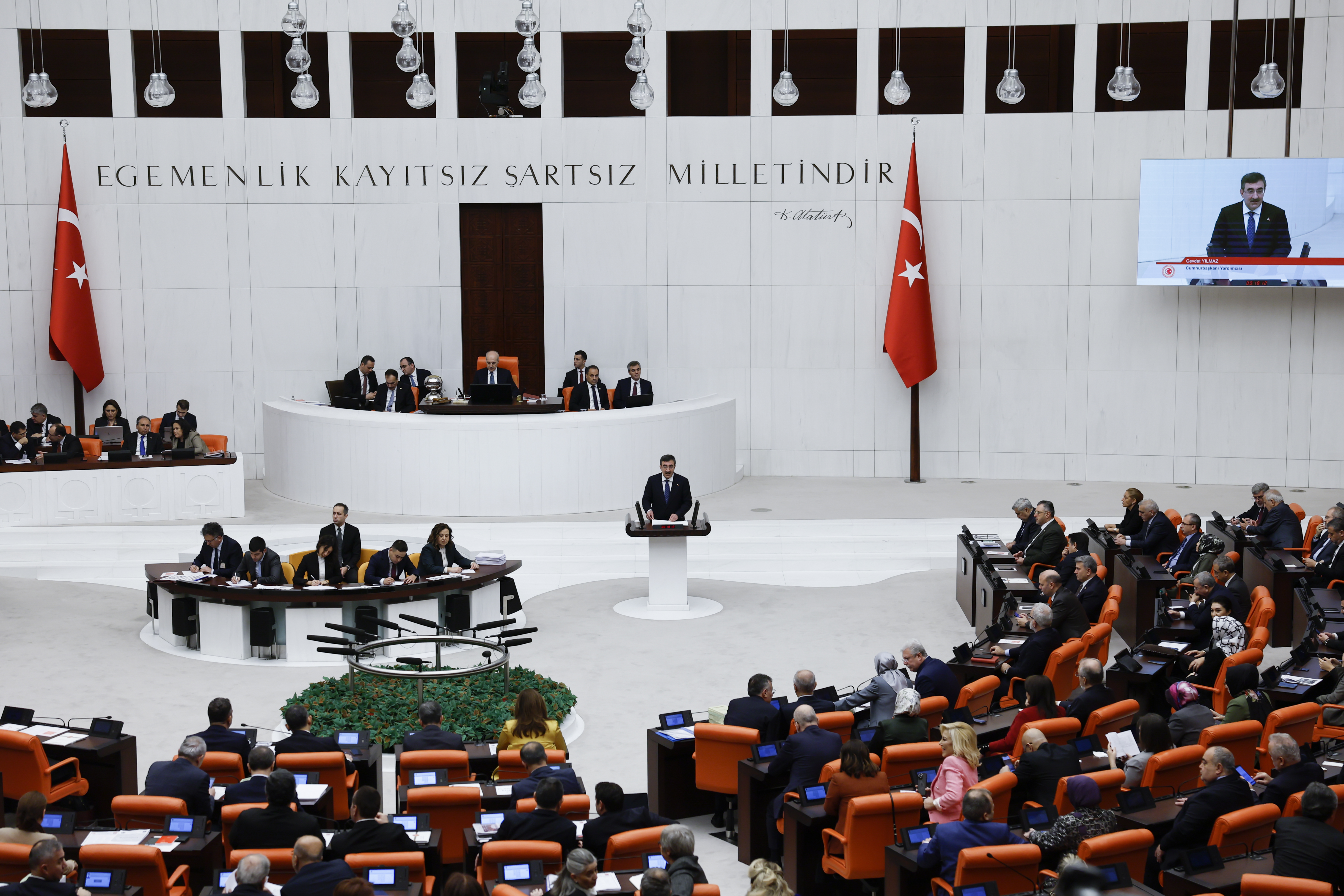 Cumhurbaşkanı Yardımcısı Cevdet Yılmaz, TBMM Genel Kurulunda görüşmelerine başlanan 2024 Yılı Merkezi Yönetim Bütçe Kanunu Teklifi ile 2022 Yılı Merkezi Yönetim Kesin Hesap Kanunu Teklifi'nin sunuş konuşmasını yaptı.