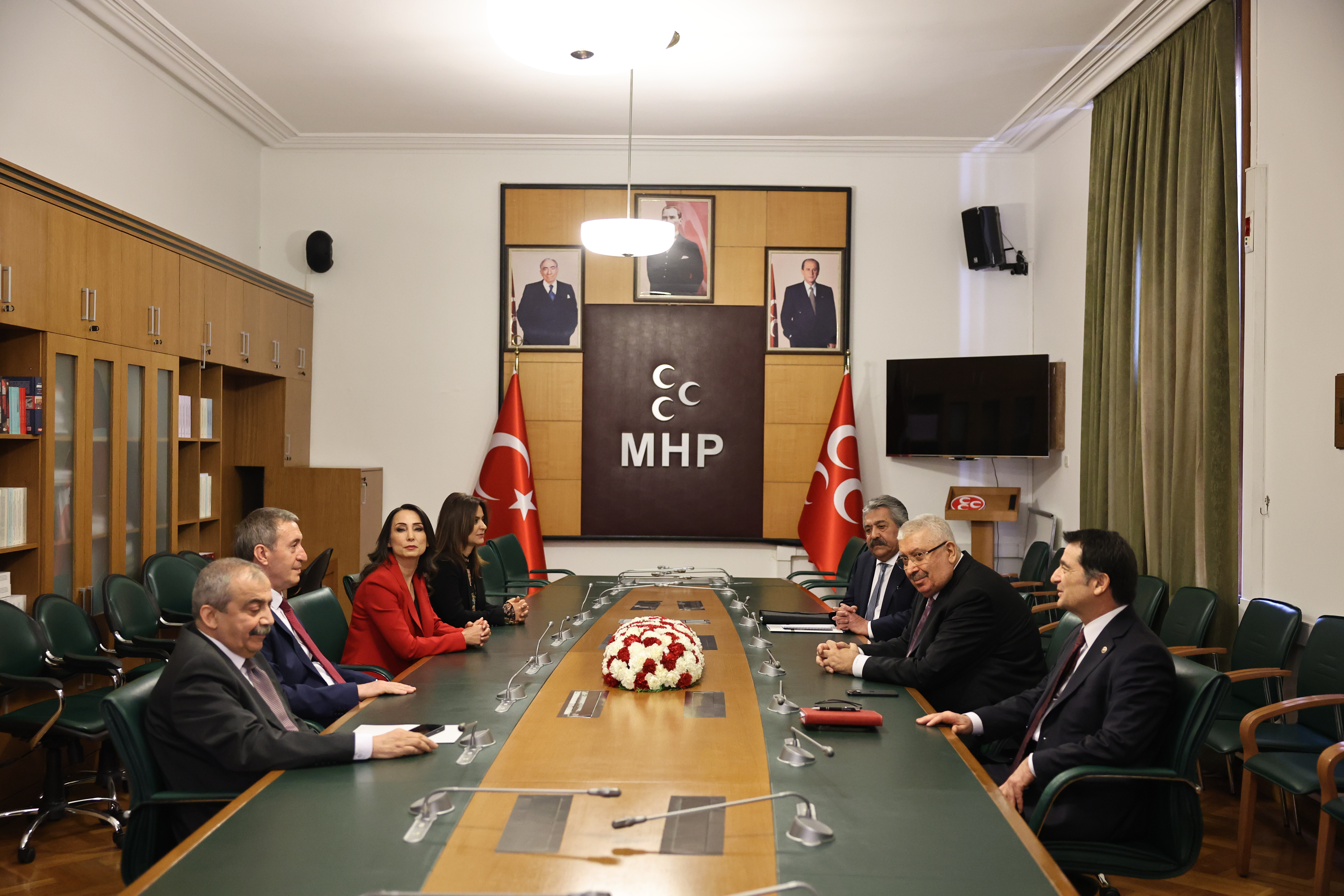 MHP TBMM Grup Yönetim Kurulu Toplantı Salonu'nda gerçekleşen görüşmede, DEM Parti'den Bakırhan ve Hatimoğulları'nın yanı sıra Grup Başkanvekili Gülüstan Kılıç Koçyiğit ve İstanbul Milletvekili Sırrı Süreyya Önder yer aldı.