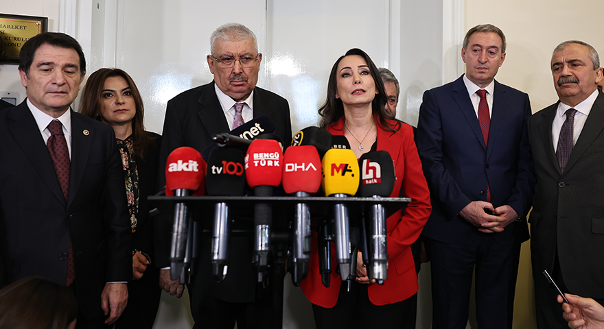 Tülay Hatimoğulları ise yaşanan süreçle ilgili görüşmelerde bulunduklarını belirterek, tüm görüşmeleri tamamladıktan sonra detaylı açıklama yapacaklarını bildirdi. MHP heyetine teşekkür eden Hatimoğulları, "Sayın Devlet Bahçeli, sağlık koşulları elverseydi, bugün bu görüşmede olacaktı fakat sağlık koşullarından dolayı kendisinin yetkilendirdiği heyetle görüştük. Biz, kendisine bir kez daha geçmiş olsun dileklerimizi iletiyoruz. Acil şifalar diliyoruz." ifadesini kullandı.