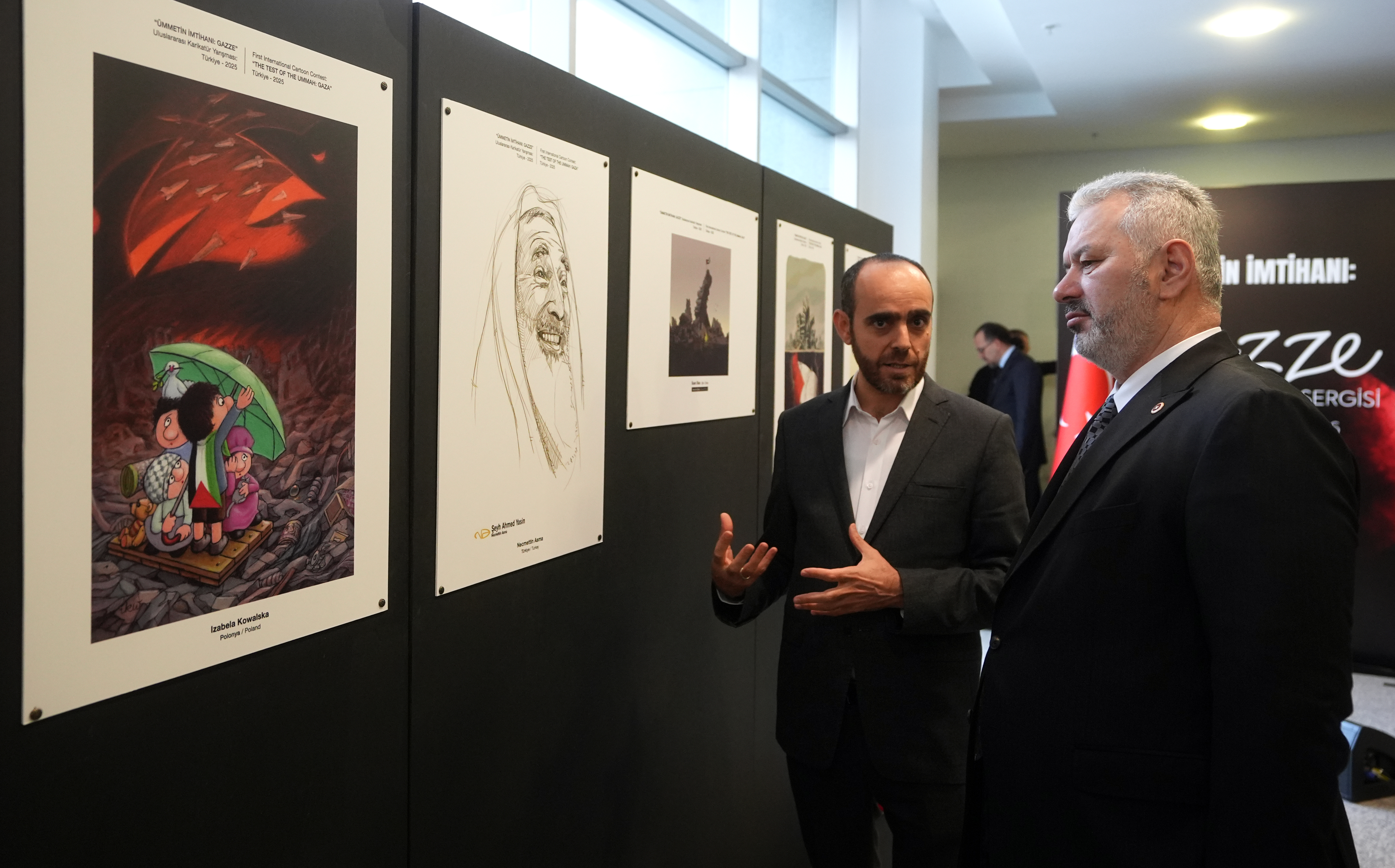 Sergide 50'ye yakın eserin bulunduğunu, 49 ülkeden sanatçının sergiye katılım gösterdiğini belirten Turan, "500'e yakın eser göndermişler. O eserleri, jüri üyelerimiz titizlikle seçmiş, biraz önce sergiyi gezdiğimizde gördüğümüz manzara, gerçekten yüreklerimizi sızlatan ama yüreğimiz, insanlığımız ve değerlerimiz adına da bizlere umut veren manzara." dedi.