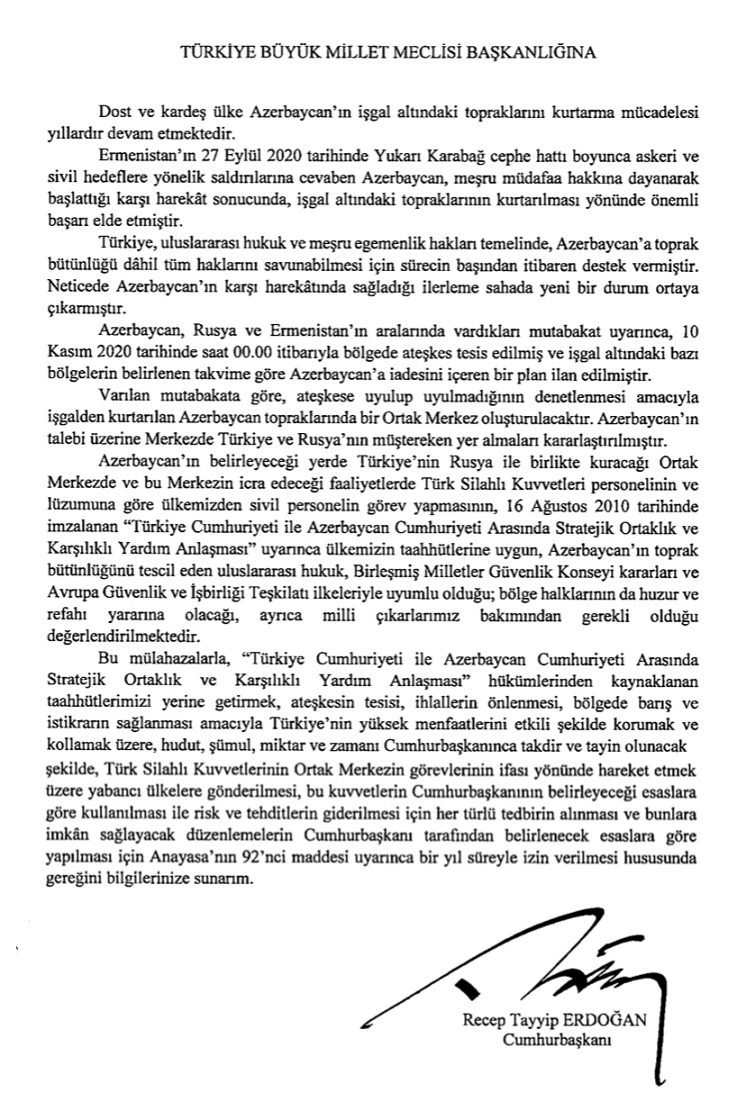 Bu mülahazalarla, 'Türkiye Cumhuriyeti ile Azerbaycan Cumhuriyeti Arasında Stratejik Ortaklık ve Karşılıklı Yardım Anlaşması' hükümlerinden kaynaklanan taahhütlerimizi yerine getirmek, ateşkesin tesisi, ihlallerin önlenmesi, bölgede barış ve istikrarın sağlanması amacıyla Türkiye'nin yüksek menfaatlerini etkili şekilde korumak ve kollamak üzere, hudut, şümul, miktar ve zamanı Cumhurbaşkanınca takdir ve tayin olunacak şekilde, Türk Silahlı Kuvvetlerinin Ortak Merkezin görevlerinin ifası yönünde hareket etmek üzere yabancı ülkelere gönderilmesi, bu kuvvetlerin Cumhurbaşkanının belirleyeceği esaslara göre kullanılması ile risk ve tehditlerin giderilmesi için her türlü tedbirin alınması ve bunlara imkân sağlayacak düzenlemelerin Cumhurbaşkanı tarafından belirlenecek esaslara göre yapılması için Anayasa'nın 92'inci maddesi uyarınca bir yıl süreyle izin verilmesi hususunda gereğini bilgilerinize sunarım."
