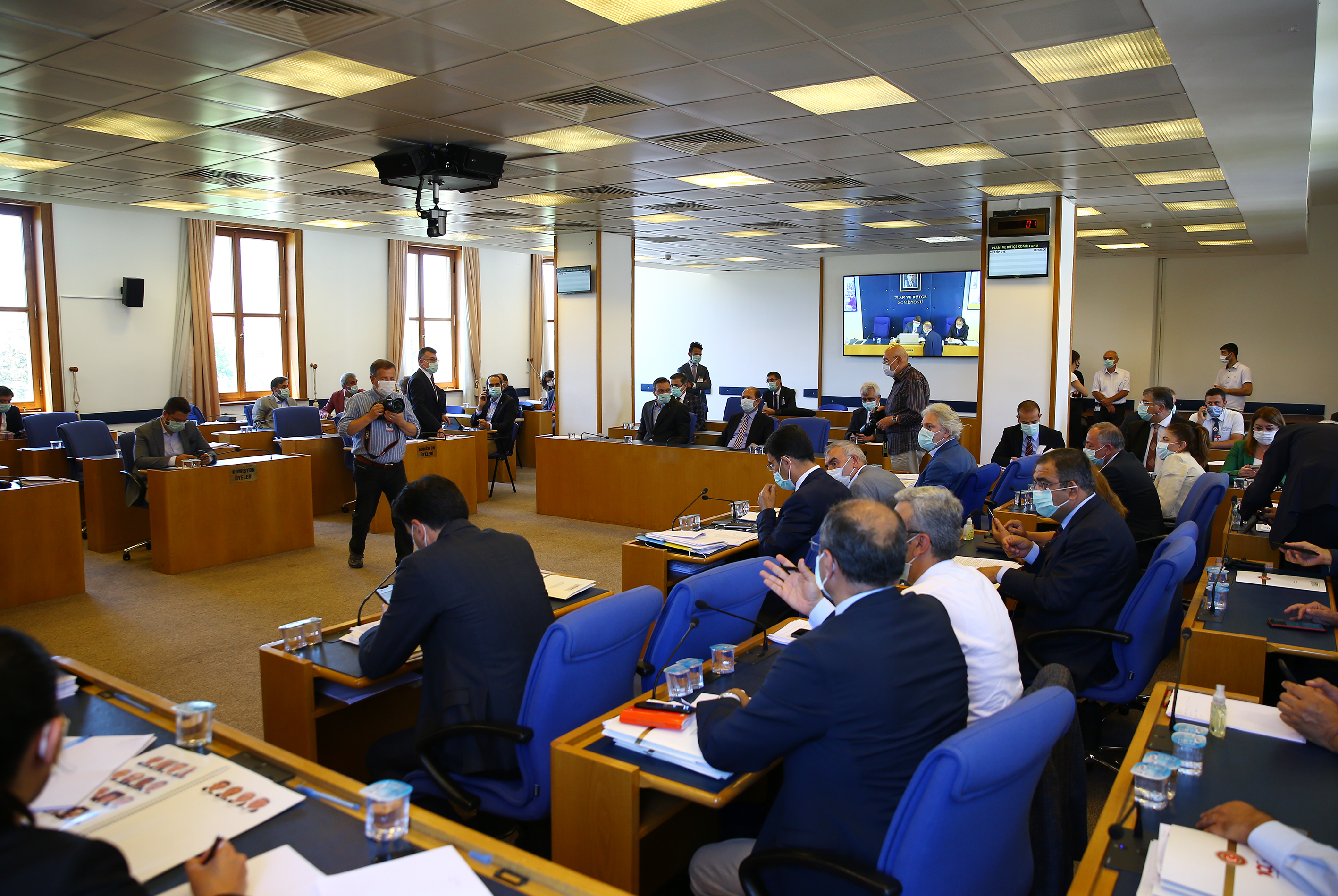 Kovid-19 tedbirleri kapsamında, daha geniş alana sahip TBMM Plan ve Bütçe Komisyonu Toplantı Salonu'nda gerçekleştirilen toplantıda, teklifin maddeleri üzerinde konuşmalar yapılıyor.