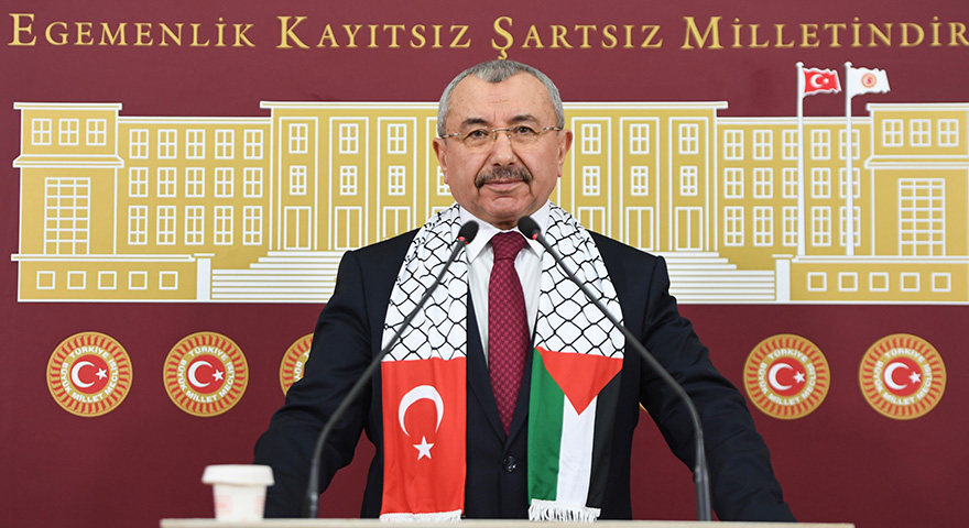 AK Partili Erdem, Meclis'te boynunda üzerinde Filistin ve Türk bayraklarının bulunduğu atkısıyla düzenlediği basın toplantısında, 7 Ekim'den bu yana Gazze'de bir insanlık dramı yaşandığını kaydetti.