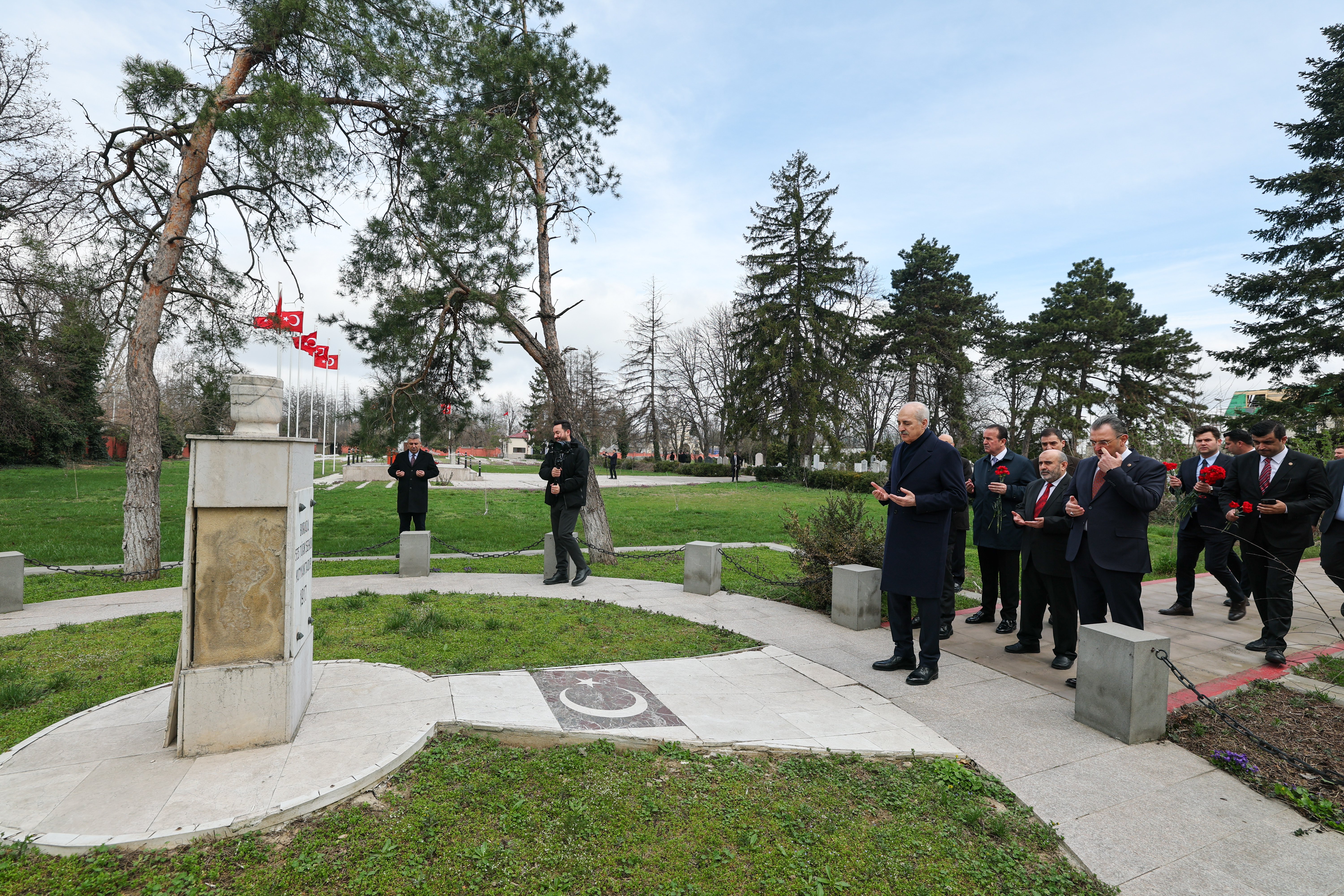Kurtulmuş, ziyaretinde, şehitlik anıtına, üzerinde "TBMM Başkanı" yazılı kırmızı beyaz karanfillerden oluşan çelenk bıraktı. Kur’an-ı Kerim okunmasının ardından dua eden Kurtulmuş, mezarlara da karanfiller koydu.