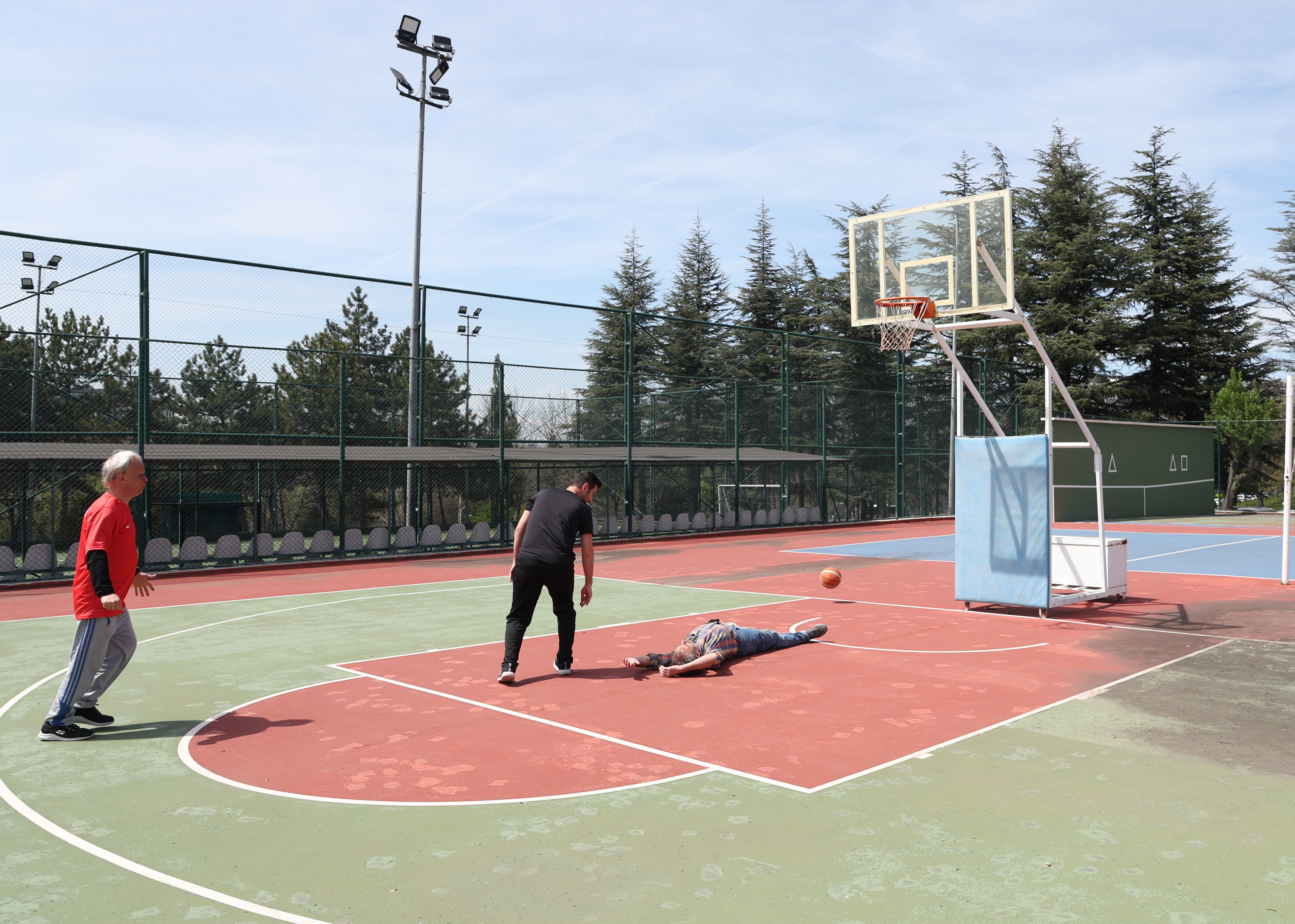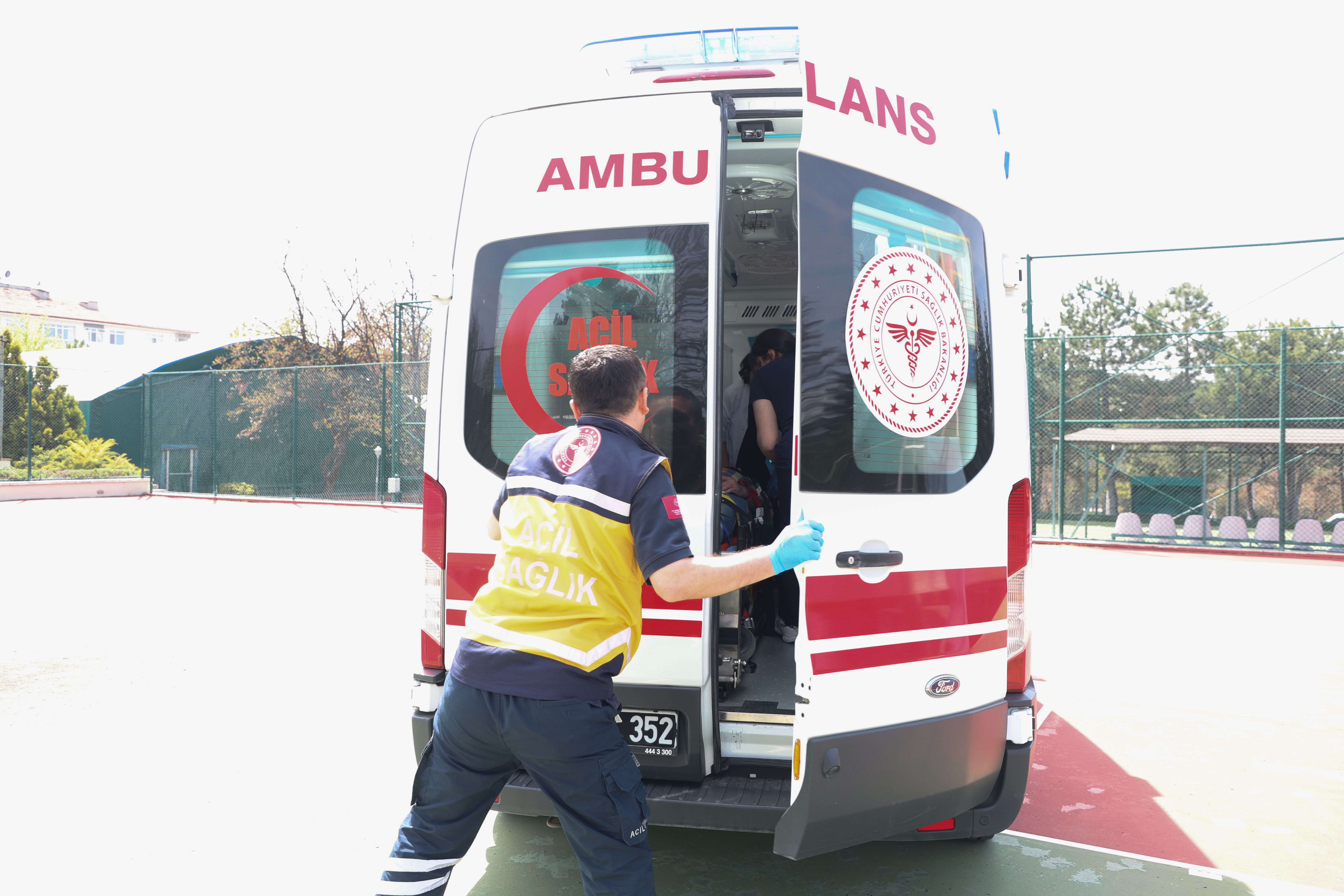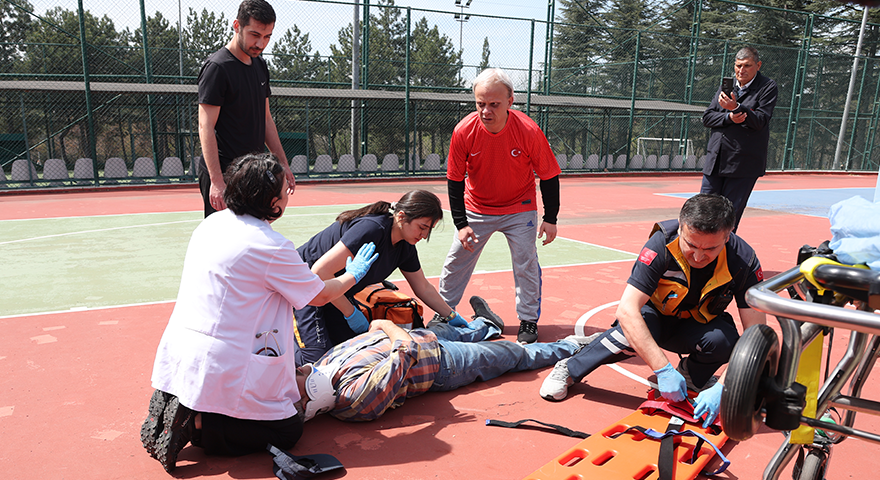 Tatbikatta, Meclis Ana Binada hizmet veren 112 acil servisi, senaryo gereği basketbol oynarken düşüp kafa travması geçiren hastaya müdahalede bulundu.