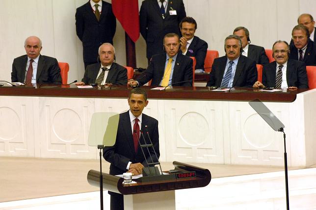 ABD Başkanı Barack Obama, ABD ve Türkiye'nin, her zaman, her konuda aynı fikirde olmadığını, bunun zaten beklenemeyeceğini, hiçbir ulus arasında da bunun görülmediğini vurguladı. Pek çok zorlukları, son 60 yıl içinde birlikte ele aldıklarına dikkati çeken Obama, ''Müttefikliğimizin gücü nedeniyle hem ABD hem de Türkiye, daha güçlendi, dünyada daha güvenli bir yer oldu'' dedi. Obama, artık iki demokrasinin önünde, daha önceden görülmeyen bir takım güçlüklerin bulunduğuna işaret ederek, bunlar içerisinde, sınır tanımayan ekonomik krizlerin olduğunu kaydetti. Aşırı uçların, kadınları, çocukları hiç acımadan öldürdüğünü, enerji arzının önünde güçlüklerin bulunduğunu, iklim değişikliği sorunlarının olduğunu belirten Obama, sözlerine şöyle devam etti: ''Dünyanın en öldürücü silahlarının artması ve beraberinde süre giden çatışmalar var. Bu bahsedilenler, bizim daha yeni yaşamaya başladığımız yüzyılımızın önemli sorunları. Bunlara nasıl cevap vereceğimiz, geleceğin özgürlükle mi yoksa korkuyla mı, yoksullukla mı yoksa refahla mı şekilleneceğini belirleyecek. Güçle mi yoksa adil ve devam eden bir barışla mı? Şu kadarından emin olduğumu söyleyebilirim; hiçbir ulus bahsettiğim zorluklara tek başına karşı gelemez. Bu kapsamda, bunun başarılabilmesi için tüm ulusların birlikte çalışması gerekiyor. O nedenle birbirimizi dinlemeli ve ortak hedeflere yönelik çalışmalıyız. Bu nedenle müşterek menfaatlerimiz üzerinde çalışmalıyız ve farklılıklarımızın ötesine geçebilmeliyiz. Bizler bunu yaptığımızda, bir arada çalıştığımızda daha da güçleniriz.''