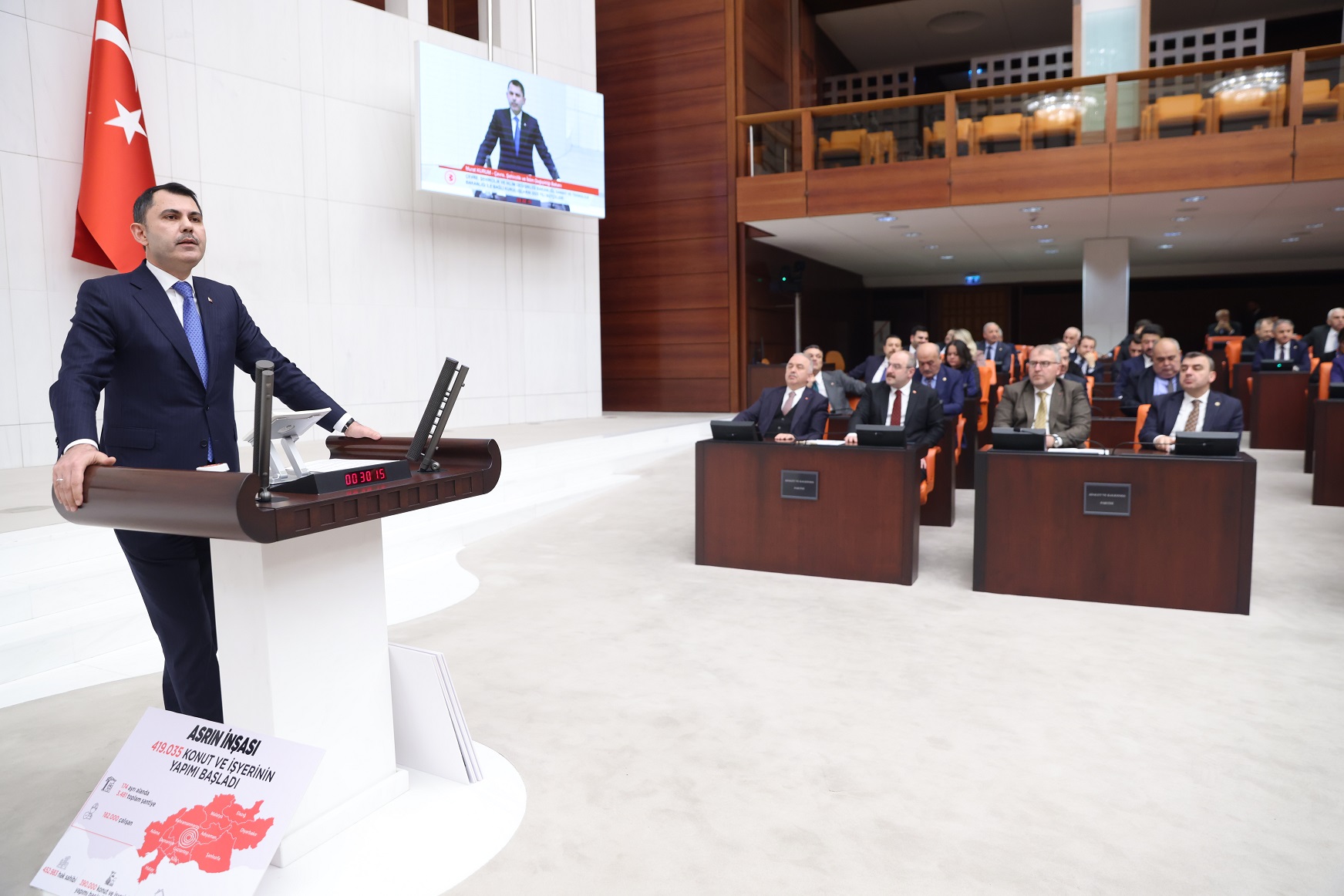 Kurum, 30 Kasım'da Cumhurbaşkanı Erdoğan'ın katılımıyla 155 bininci konutun anahtarlarını teslim ettiklerini dile getirerek, "Sayın Özgür Özel 5 gün önce bu kürsüde tam da anlatamamakla birlikte buradaki rakamları kendince yorumladı. Şimdi ben size gazi meclisimizden doğrusunu tane tane anlatayım. Bir, şu an itibarıyla hak sahibi vatandaşlarımız için inşa edilmesi gereken konutların yüzde 93'ünün inşası başlamıştır. İki, bu yıl sonu itibarıyla, yani 20 gün sonra konutların yüzde 45'i de vatandaşlarımıza teslim edilecektir. Üç, siz isteseniz de istemeseniz de 2025 yılı sonu geldiğinde 11 ilde evine girmeyen afetzede kardeşimiz kalmayacak." ifadesini kullandı.