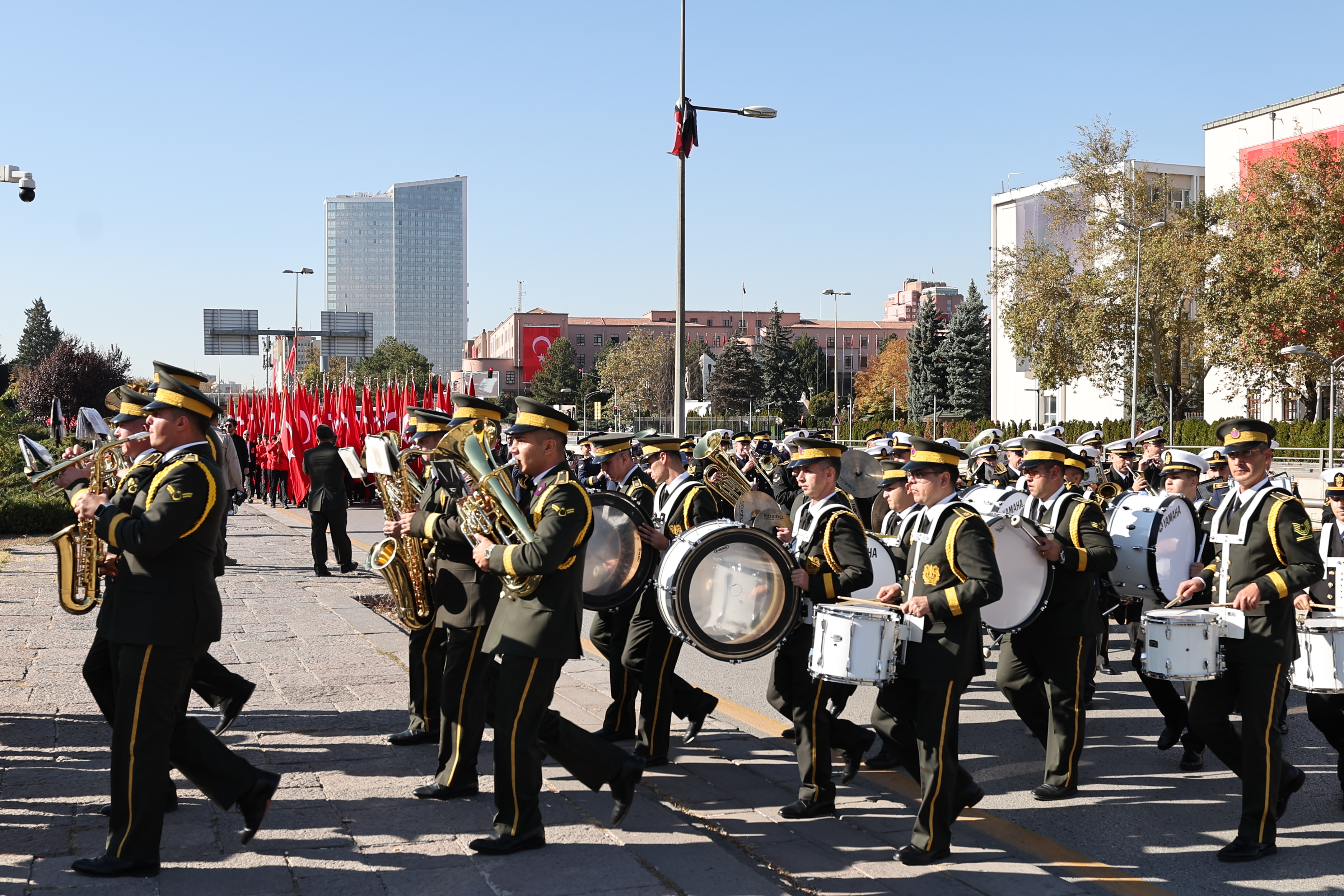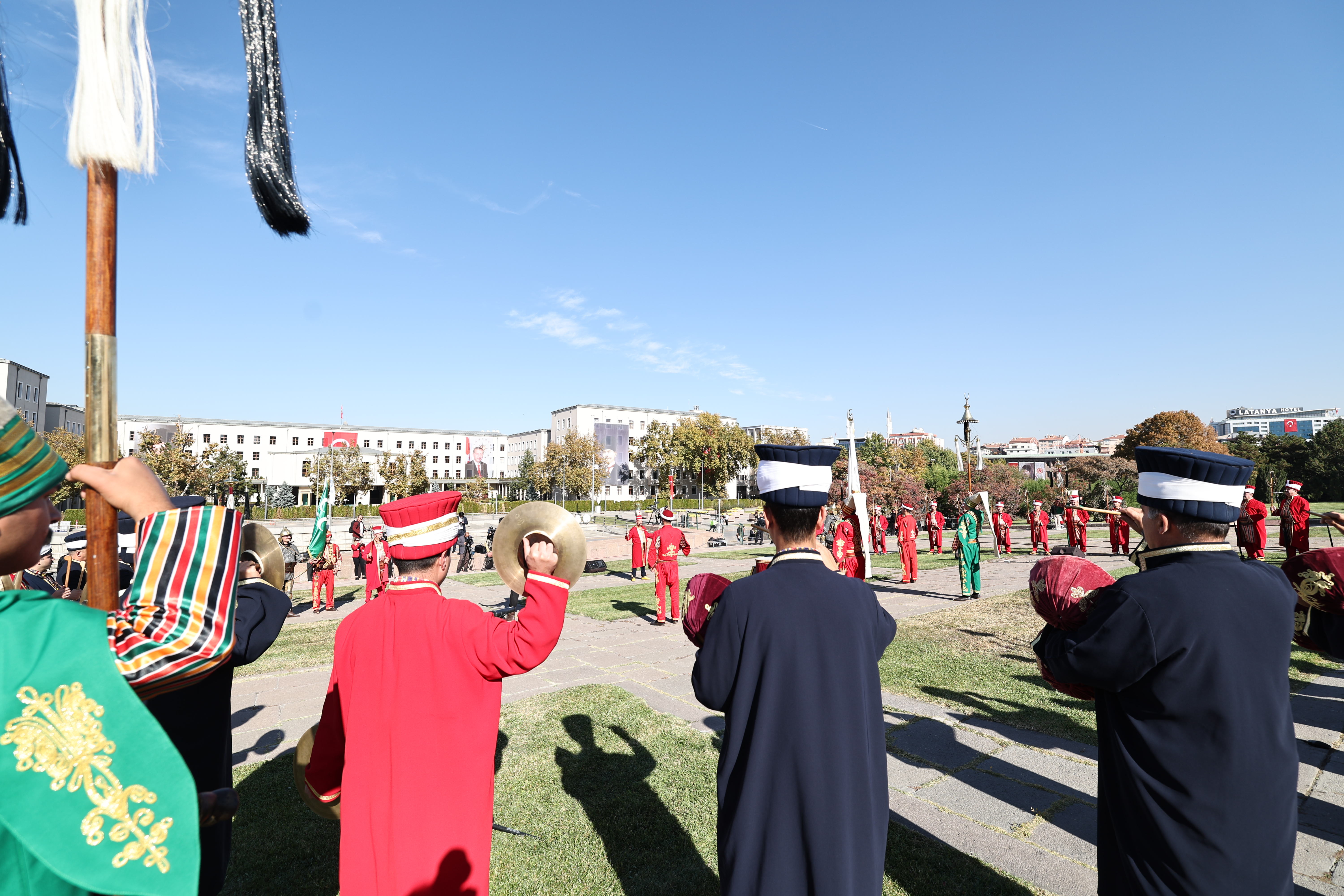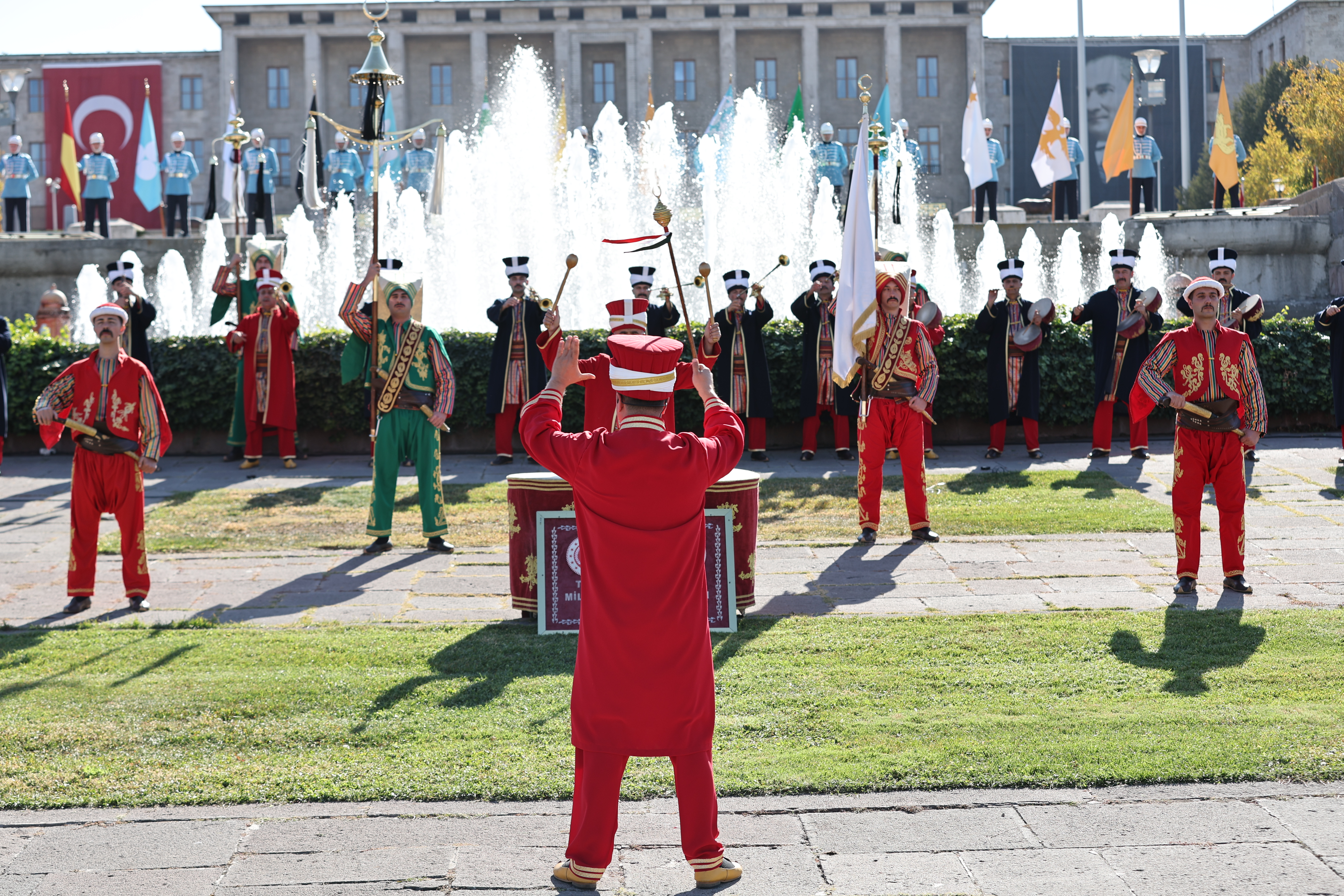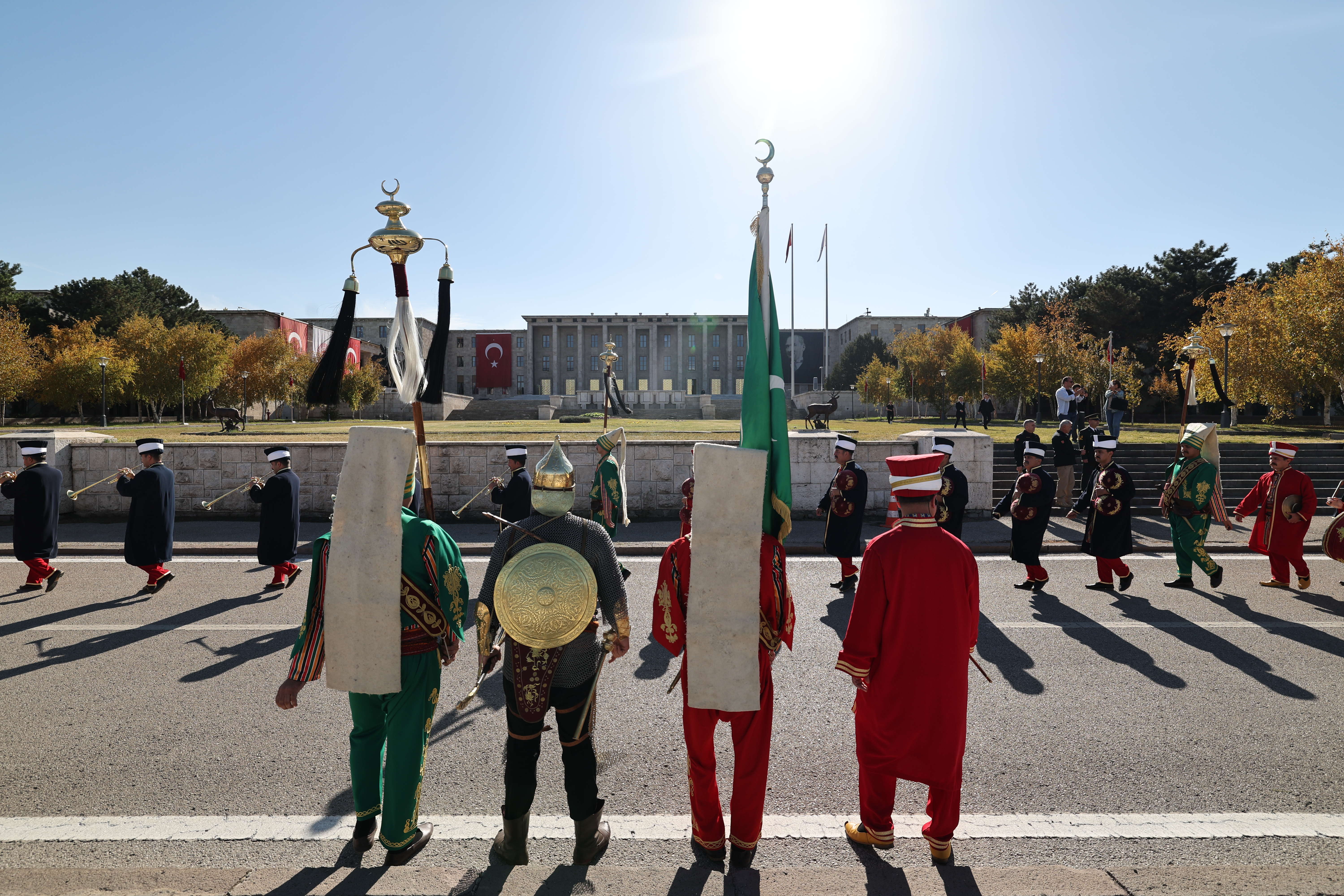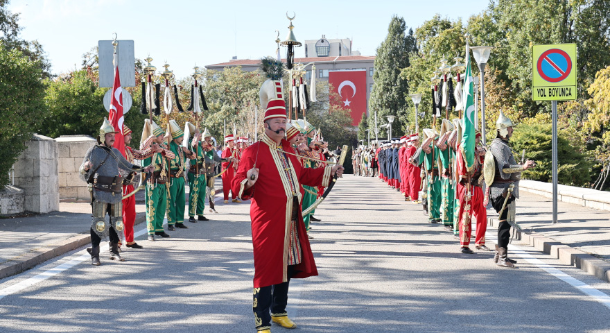 Mehteran Birliği ve TSK karma bando ekibi, saygı duruşu ve İstiklal Marşı’nın okunmasının ardından TBMM önünden Birinci Meclis binasına kadar yapılan kortej yürüyüşüne katıldı.