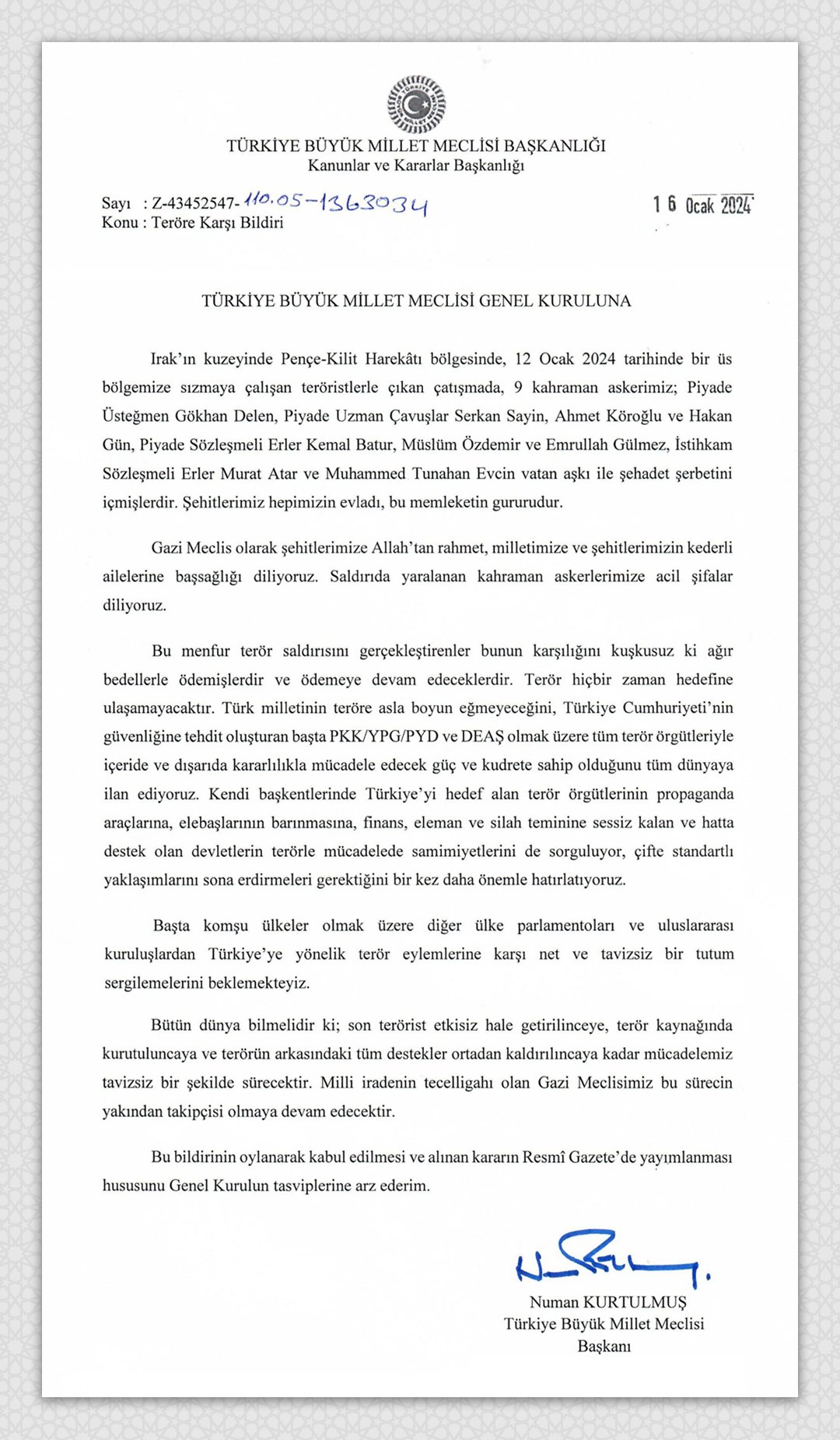 TBMM Başkanı Kurtulmuş'un imzasını taşıyan tezkerede şu ifadelere yer verildi: