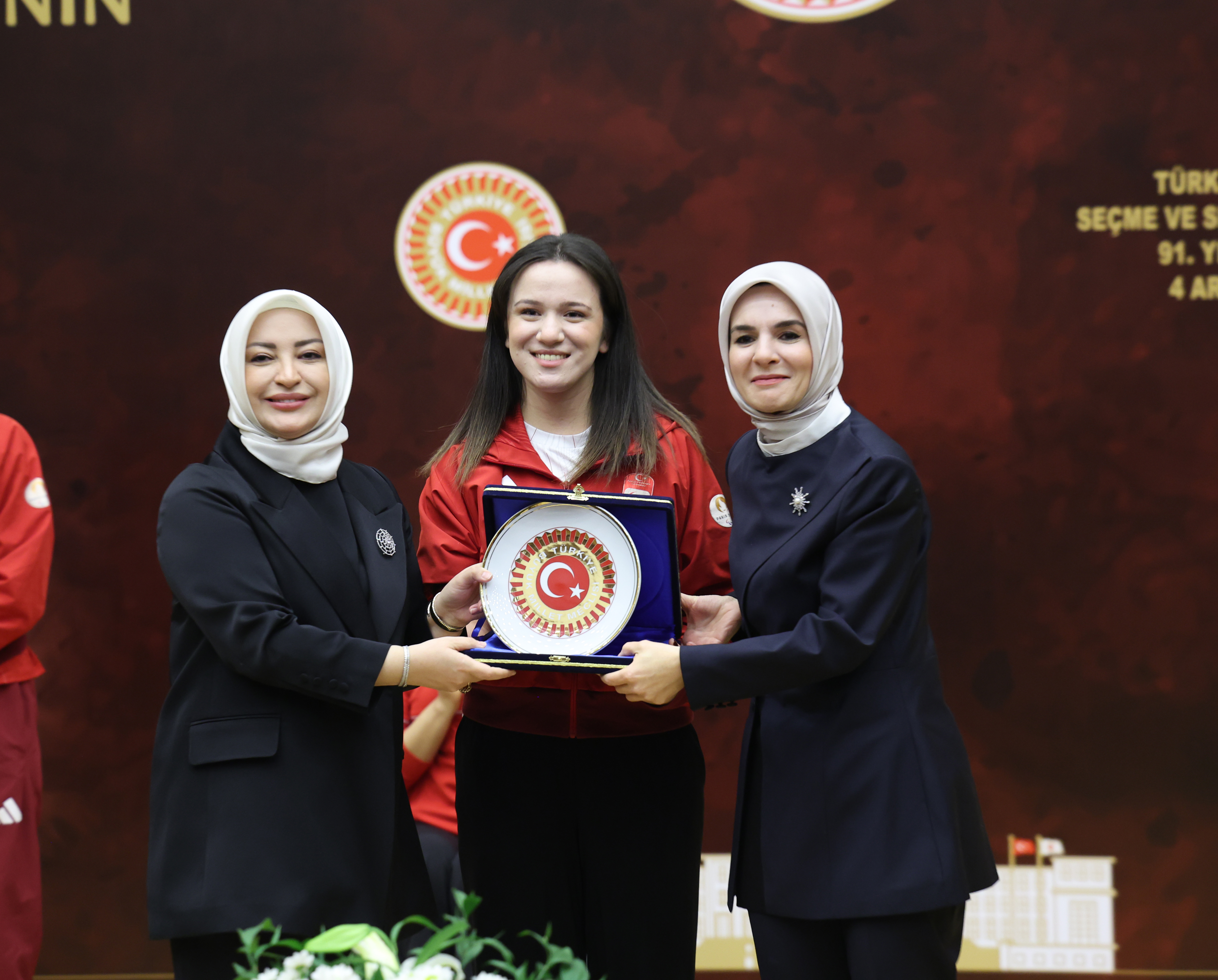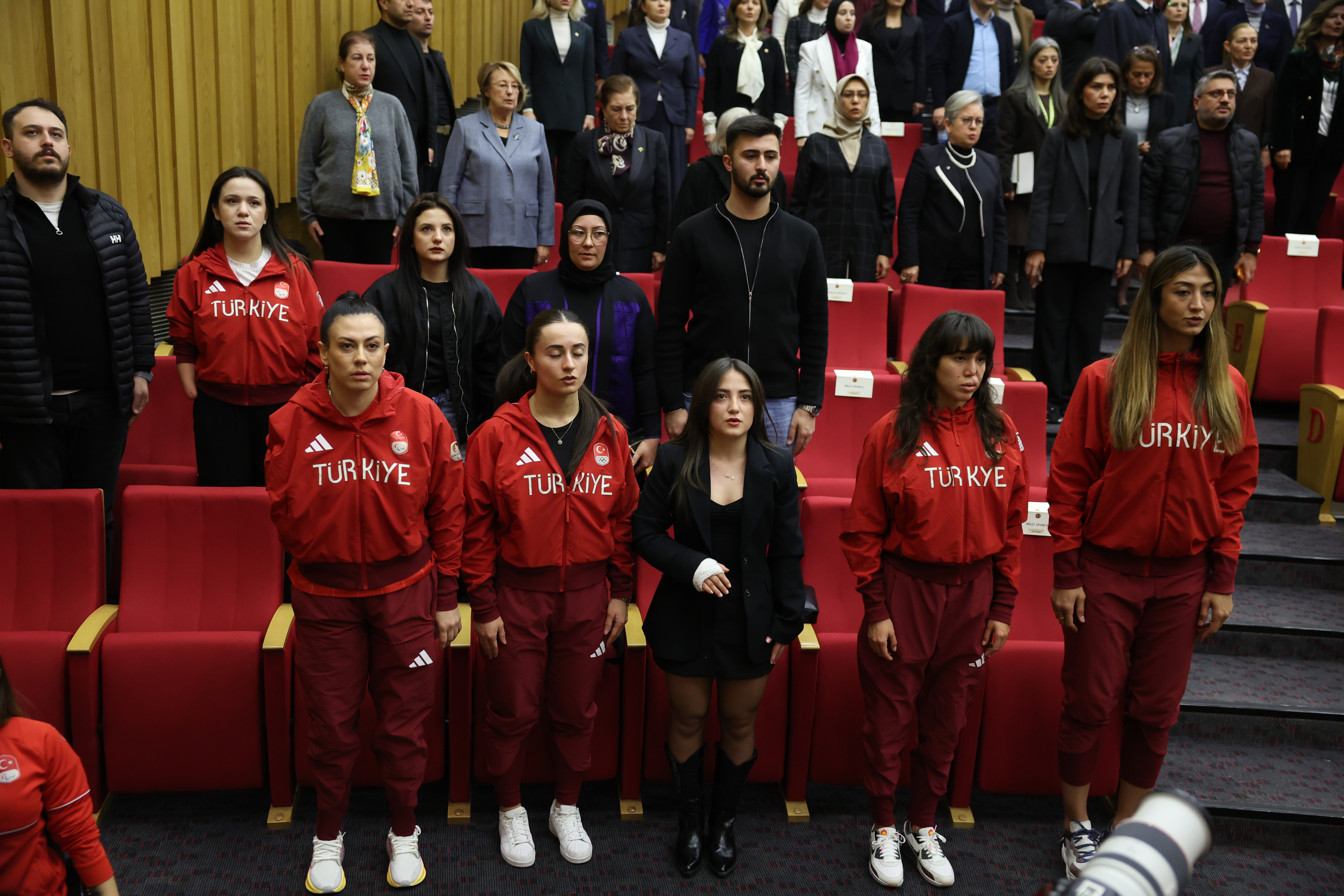 Programda, Bakan Göktaş ve KEFEK Başkanı Erdoğan, uluslararası alanda başarı elde eden kadın sporculara hediye takdim etti.
