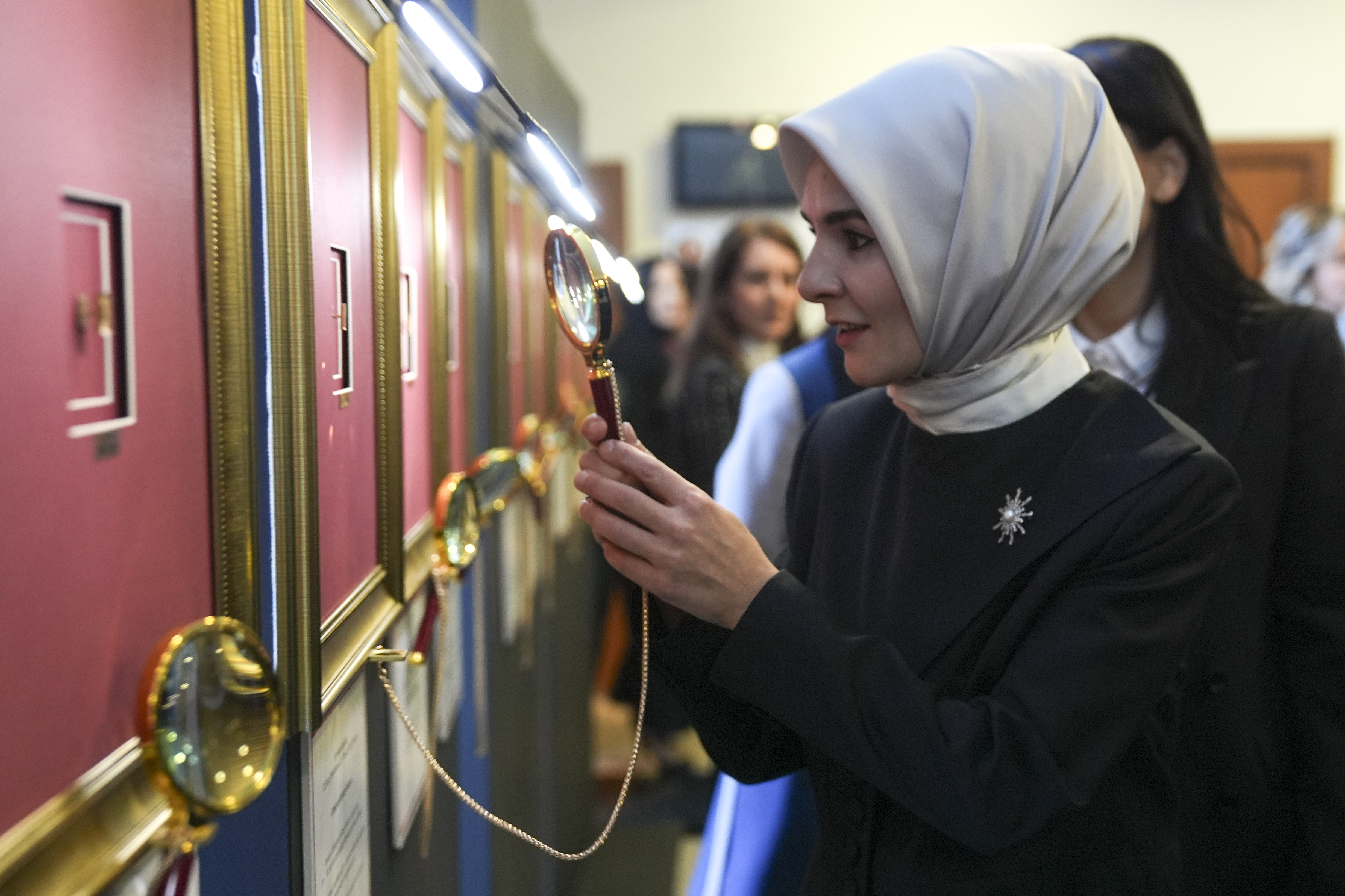 Günün anısına hatıra fotoğrafı çektirilmesinin ardından Göktaş, salonun girişinde açılan "Türkiye Yüzyılı Kadınları Mikro Art Resim Sergisi"ni gezdi.