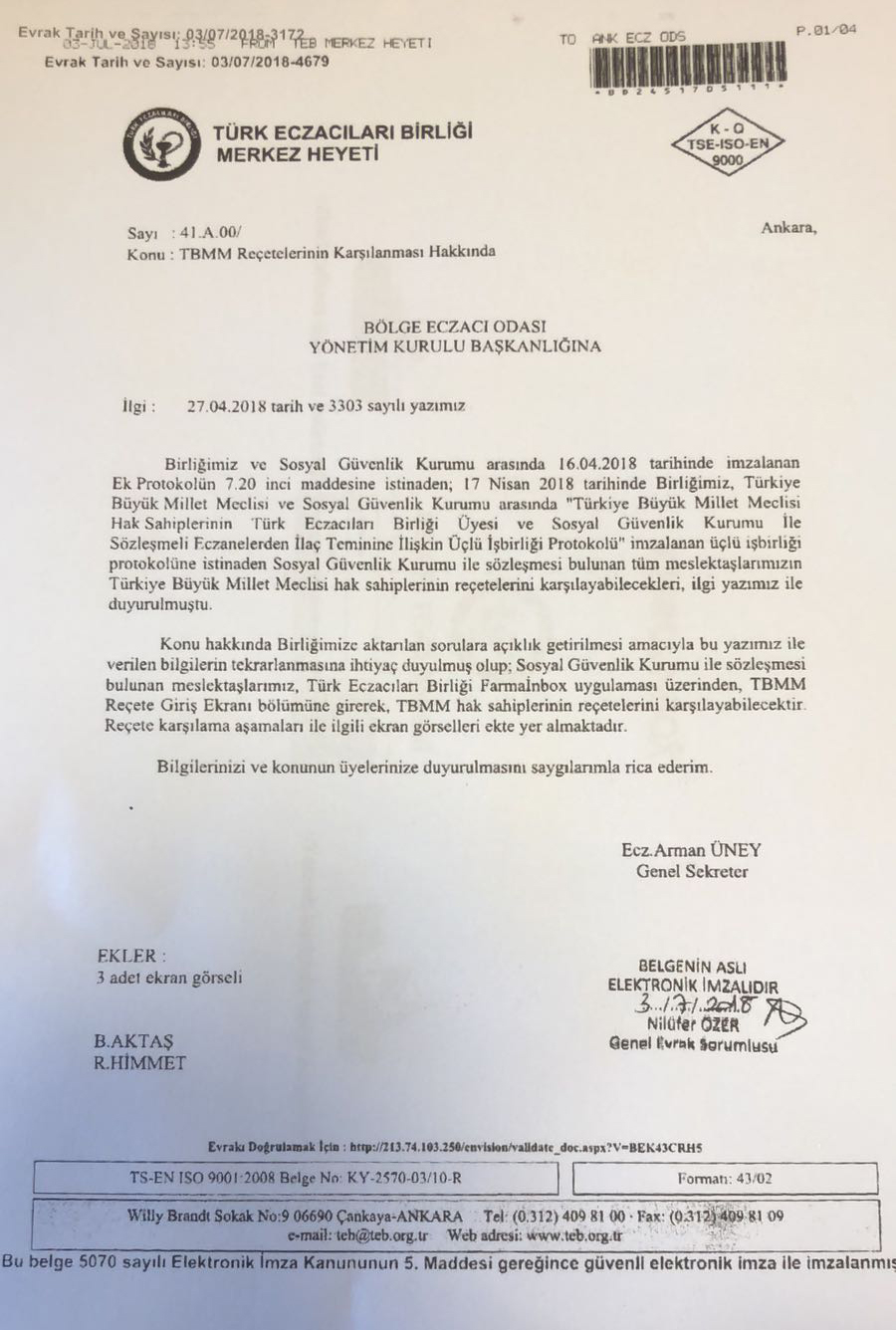 - Türkiye Büyük Millet Meclisi Hak Sahiplerinin Türk Eczacıları Birliği Üyesi ve Sosyal Güvenlik Kurumu ile Sözleşmeli Eczanelerden İlaç Teminine İlişkin Üçlü İşbirliği Protokolü (Link)