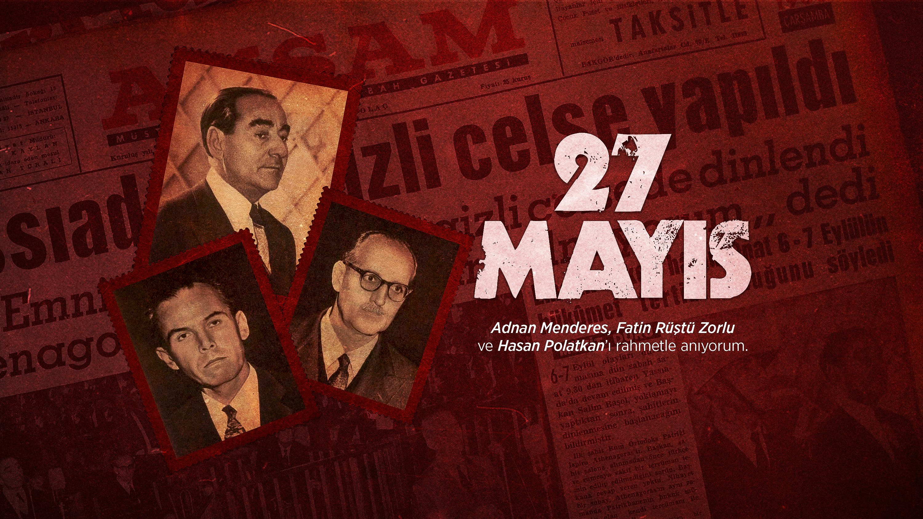 27 Mayıs Darbesi’ni bir kez daha telin ediyor, darbenin kurbanları Başbakan Adnan Menderes’i, Dışişleri Bakanı Fatin Rüştü Zorlu’yu ve Maliye Bakanı Hasan Polatkan’ı rahmetle anıyoruz.”