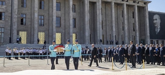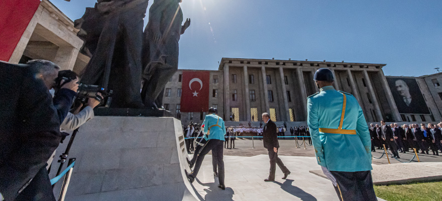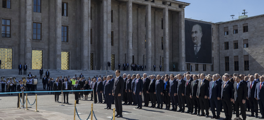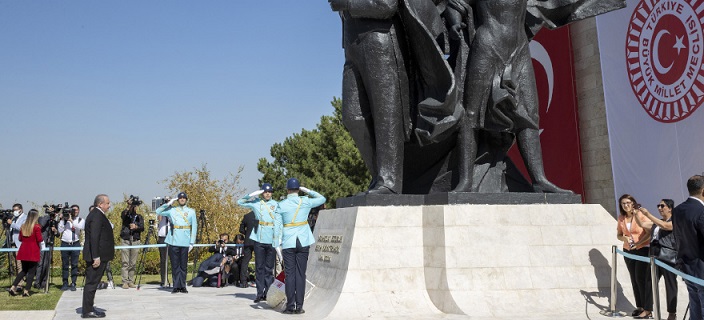TBMM Başkanı Mustafa Şentop'un anıta çelenk bırakmasının ardından bando eşliğinde saygı duruşunda bulunularak, İstiklal Marşı okundu.