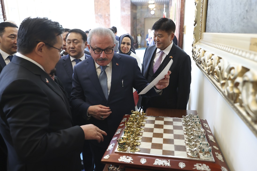 Moğolistan Ulusal Büyük Kuralı (Meclisi) Başkanı Zandanshatar Gombojav, TBMM Başkanı Mustafa Şentop'a, ilk kez Noyan Dağı'nda bulunan ve aslı Ermitaj Müzesinde sergilenen Hun ve Altay Satranç takımı hediye etti.
