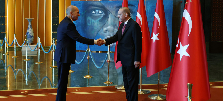 Ana bina girişinde düzenlenen törende TBMM Başkanı Numan Kurtulmuş, Cumhurbaşkanı Yardımcısı Cevdet Yılmaz, Anayasa Mahkemesi Başkanı Zühtü Arslan, Yargıtay Başkanı Mehmet Akarca, Danıştay Başkanı Zeki Yiğit, Sayıştay Başkanı Metin Yener, Cumhurbaşkanlığı Kabinesi üyeleri, MHP Genel Başkanı Devlet Bahçeli, Genelkurmay Başkanı Orgeneral Metin Gürak ve kuvvet komutanları, TBMM üyeleri, kamu kurumlarının yöneticilerinin de aralarında olduğu devlet erkanı, yabancı misyon şefleri ile uluslararası kuruluşların temsilcileri Cumhurbaşkanı Erdoğan'a bayram tebriklerini sundu.