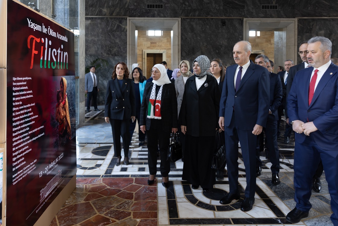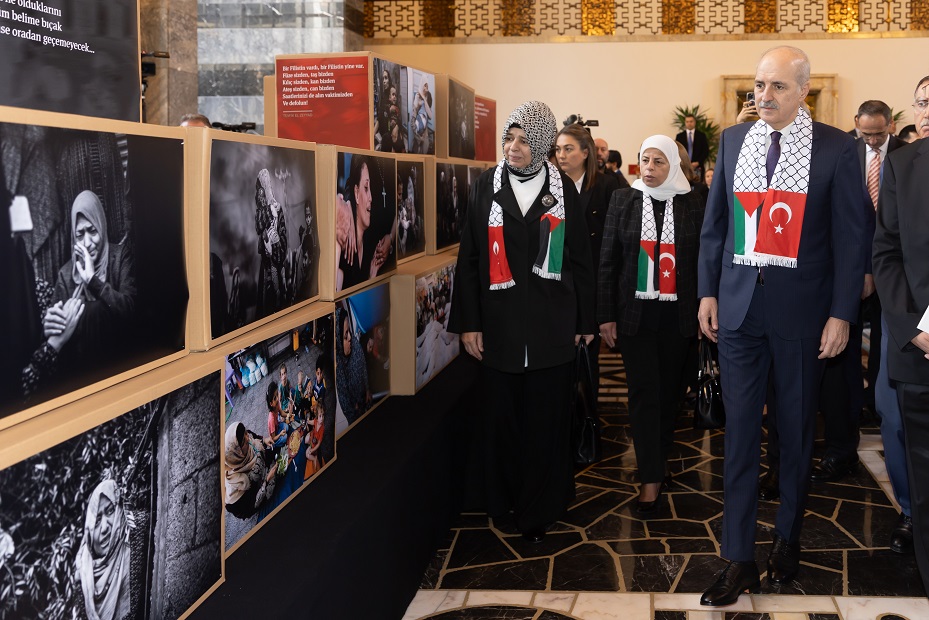 TBMM Başkanı Numan Kurtulmuş, panel öncesinde eşi Sevgi Kurtulmuş ile Meclis Şeref Salonundaki Gazze'de Kadın ve Çocuk Olmak adlı fotoğraf sergisini gezdi.