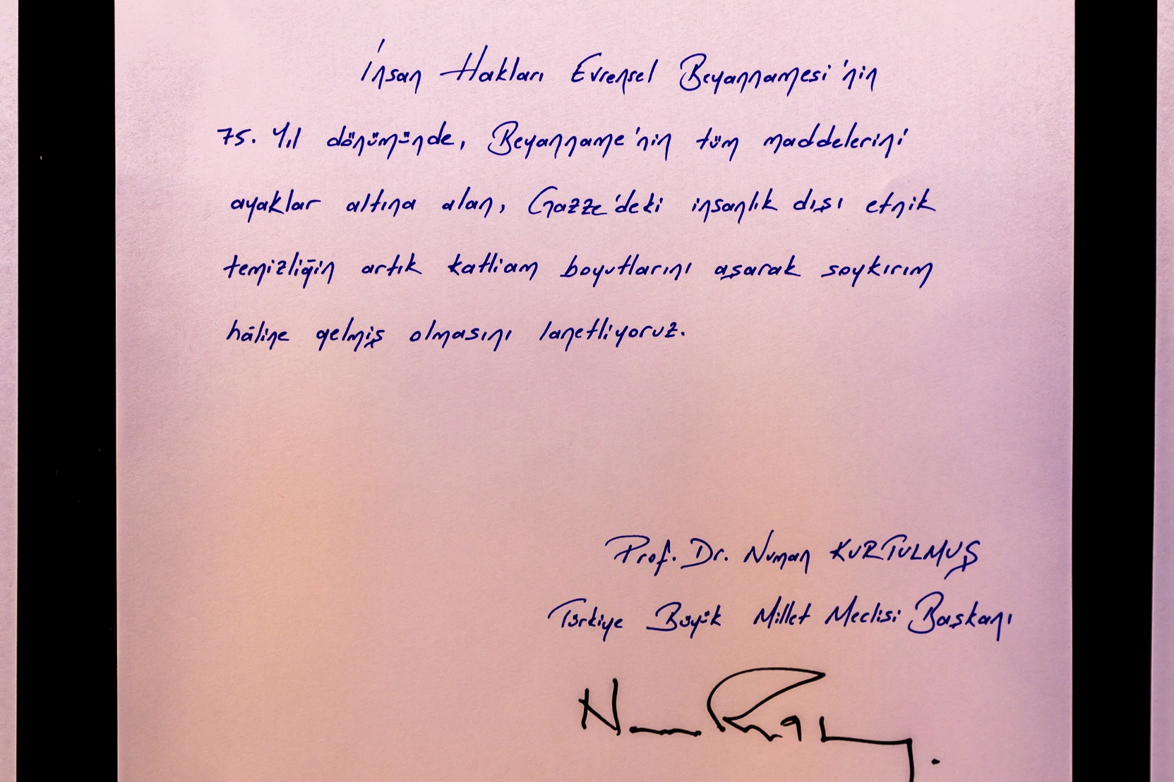 "İnsan Hakları Evrensel Beyannamesi'nin 75. yıl dönümünde, Beyanname'nin tüm maddelerini ayaklar altına alan, Gazze'deki insanlık dışı etnik temizliğin artık katliam boyutlarını aşarak soykırım haline gelmiş olmasını lanetliyoruz."