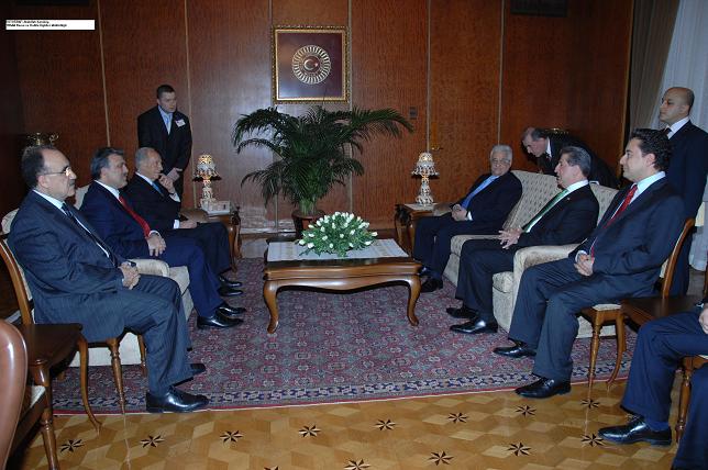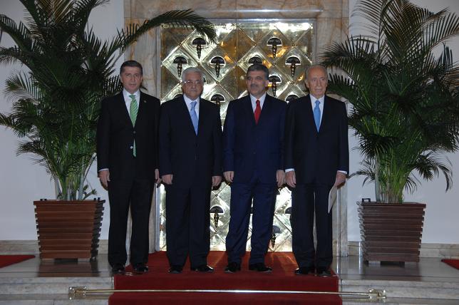 Cumhurbaşkanı Abdullah Gül'ün davetlisi olarak Türkiye'de bulunan İsrail Devlet Başkanı Shımon Peres ile Filistin Ulusal Yönetimi Başkanı Mahmoud Abbas, TBMM Başkanı Köksal Toptan'ın makamında biraraya geldi.
