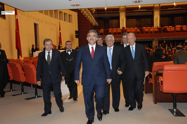 Cumhurbaşkanı Abdullah Gül, TBMM Başkanı Köksal Toptan ve konuk liderler İsrail Devlet Başkanı Shımon Peres ile Filistin Ulusal Yönetimi Başkanı Mahmoud Abbas, görüşmenin ardından TBMM Genel Kurulu'na geçtiler.