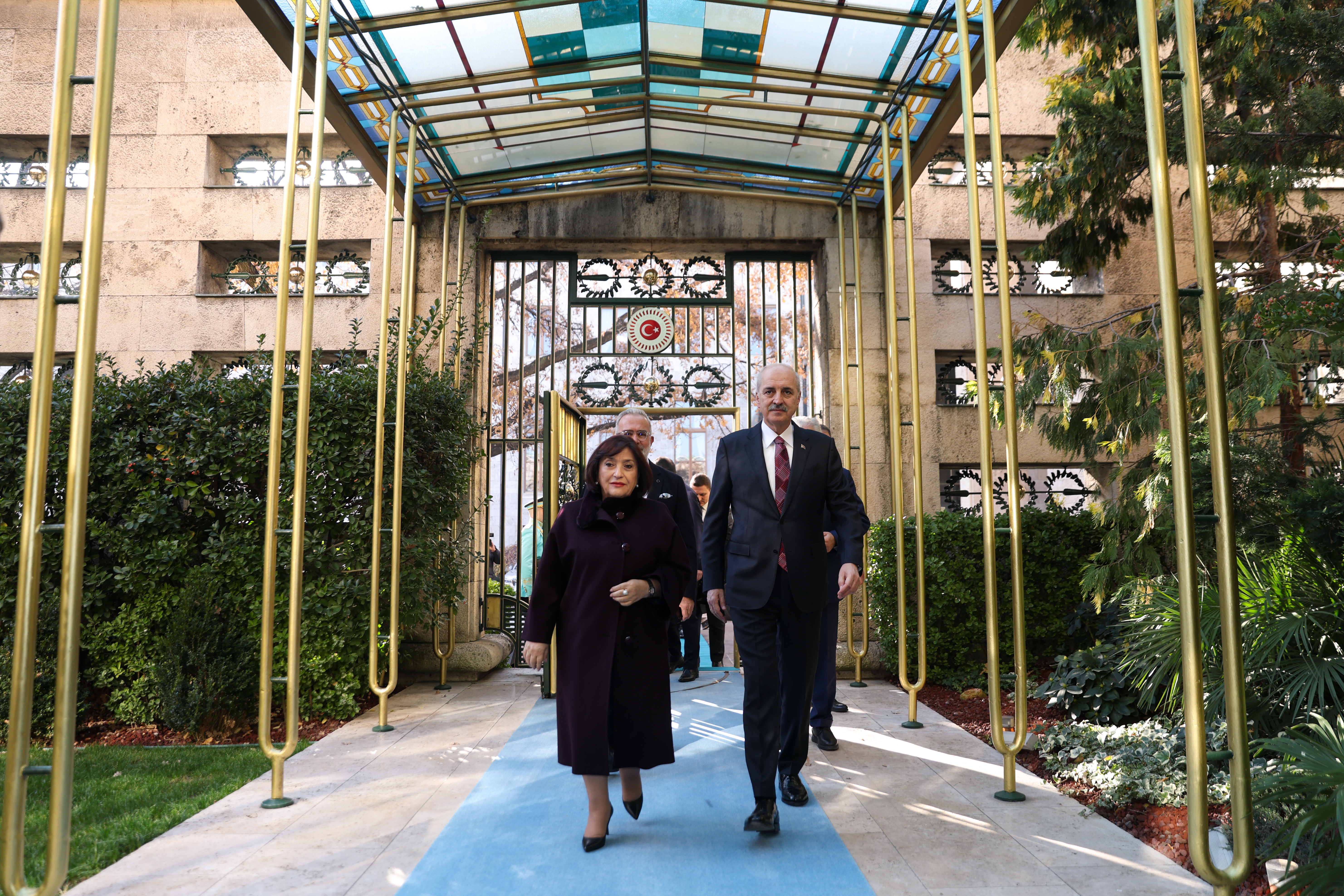 Meclis Başkanı Kurtulmuş, Türkiye'ye resmi ziyaret gerçekleştiren Azerbaycan Milli Meclis Başkanı Sahiba Gafarova ile Meclis'te bir araya geldi.