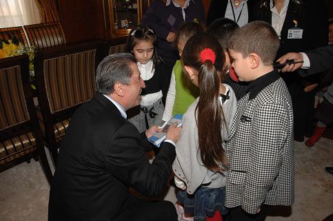 Her sayfası bir çocuk tarafından boyanmış olan ve henüz okuma yazma bilmeyen çocukların öğretmenleri tarafından yazıya geçirilen dileklerin bulunduğu defteri alan Toptan, çocuklara bayram hediyesi olarak üzerinde Atatürk ve TBMM binasının bulunduğu yapboz hediye etti.