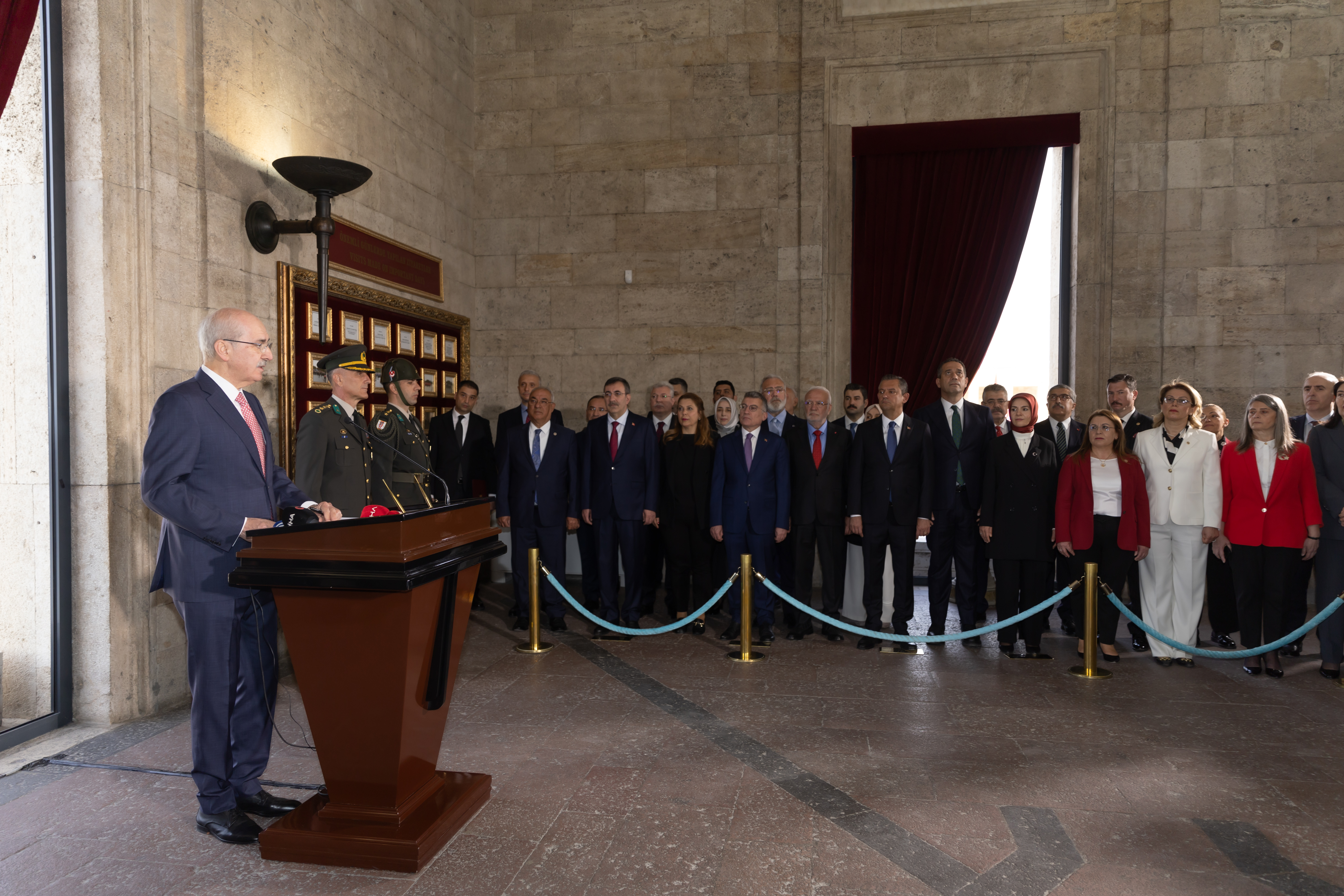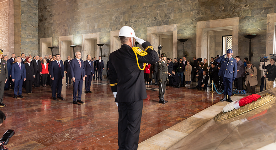 Aslanlı Yol'dan yürüyerek Gazi Mustafa Kemal Atatürk'ün mozolesine gelen heyet, TBMM Başkanı Kurtulmuş'un mozoleye çelenk bırakmasının ardından saygı duruşunda bulundu ve İstiklal Marşı'nı okudu.