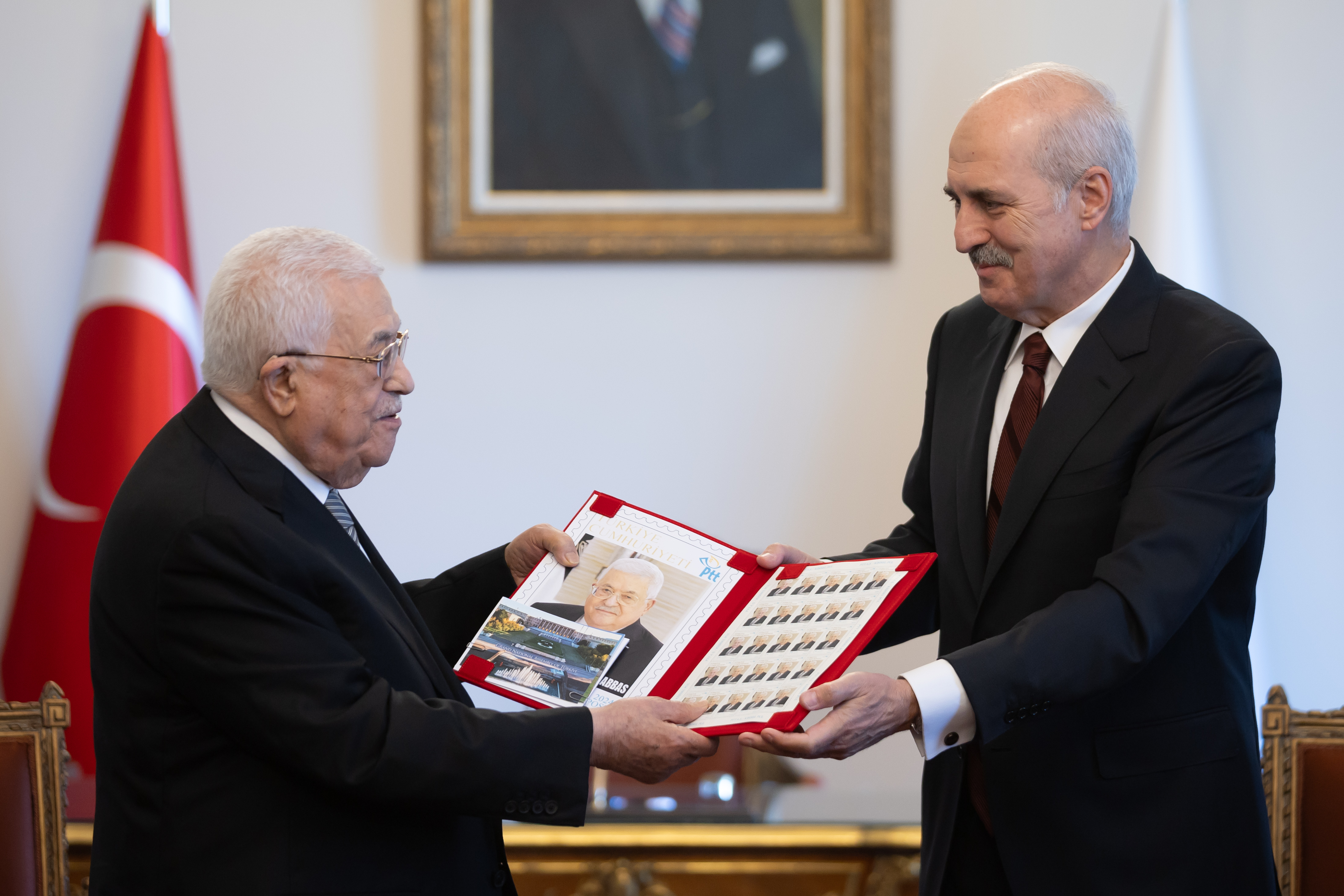 Ayrıca ziyaret anısına bastırılan hatıra pul da TBMM Başkanı Kurtulmuş tarafından Abbas’a takdim edildi.
