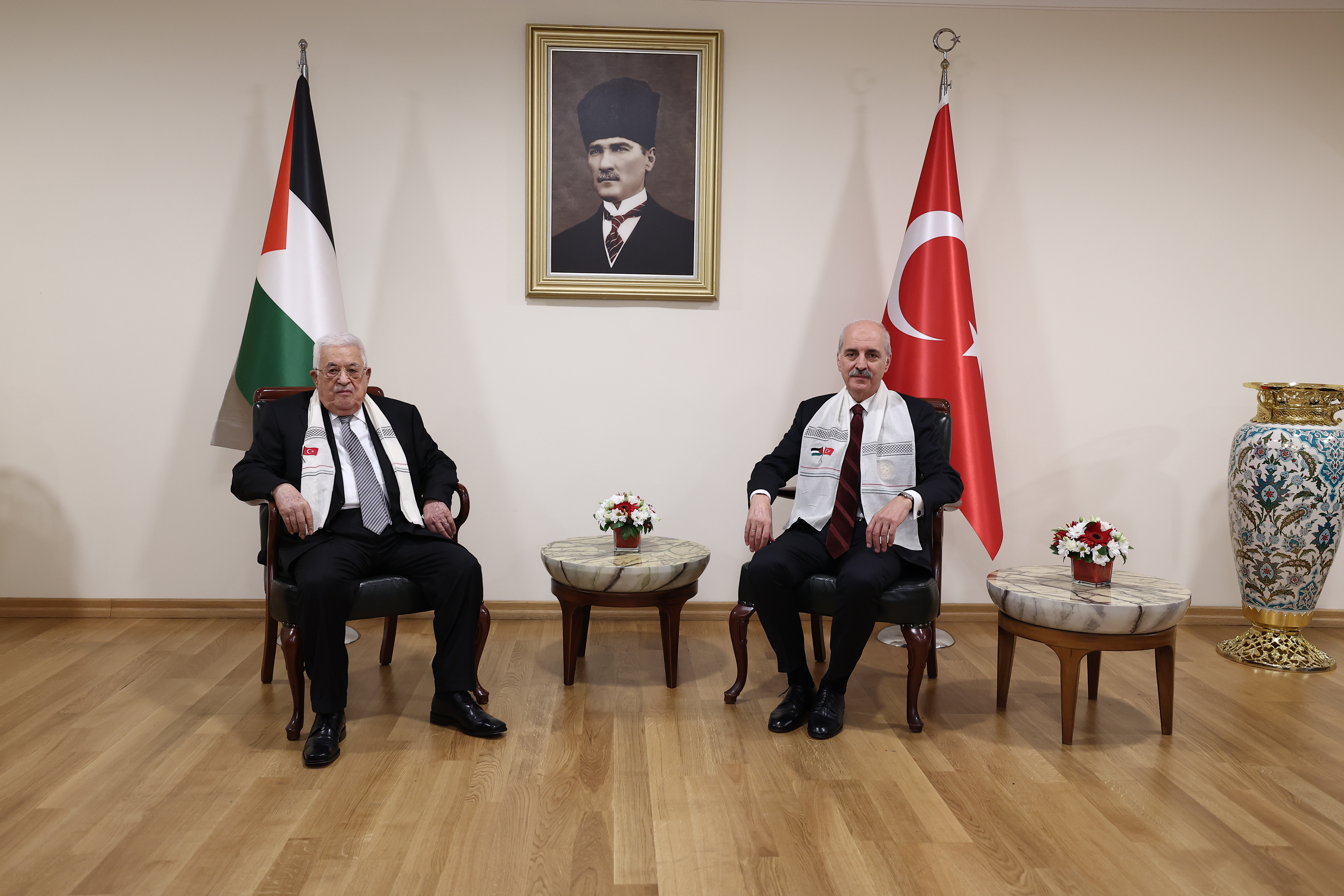 TBMM Başkanı Kurtulmuş, TBMM Genel Kurulu’na hitap etmek için Türkiye’ye gelen Filistin Devlet Başkanı Mahmud Abbas ile ikili görüşme gerçekleştirdi.