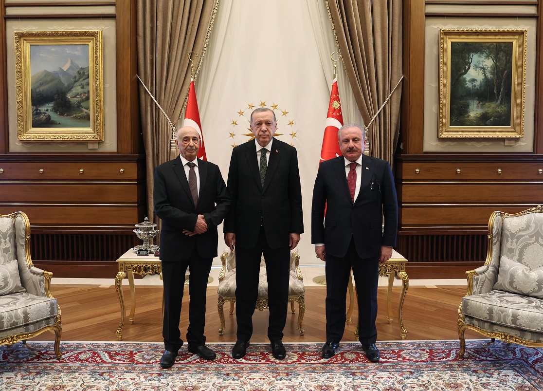 Cumhurbaşkanı Recep Tayyip Erdoğan,TBMM Başkanı Şentop ve Libya Temsilciler Meclisi Başkanı Guveyder'i Cumhurbaşkanlığı Külliyesi'nde kabul etti.