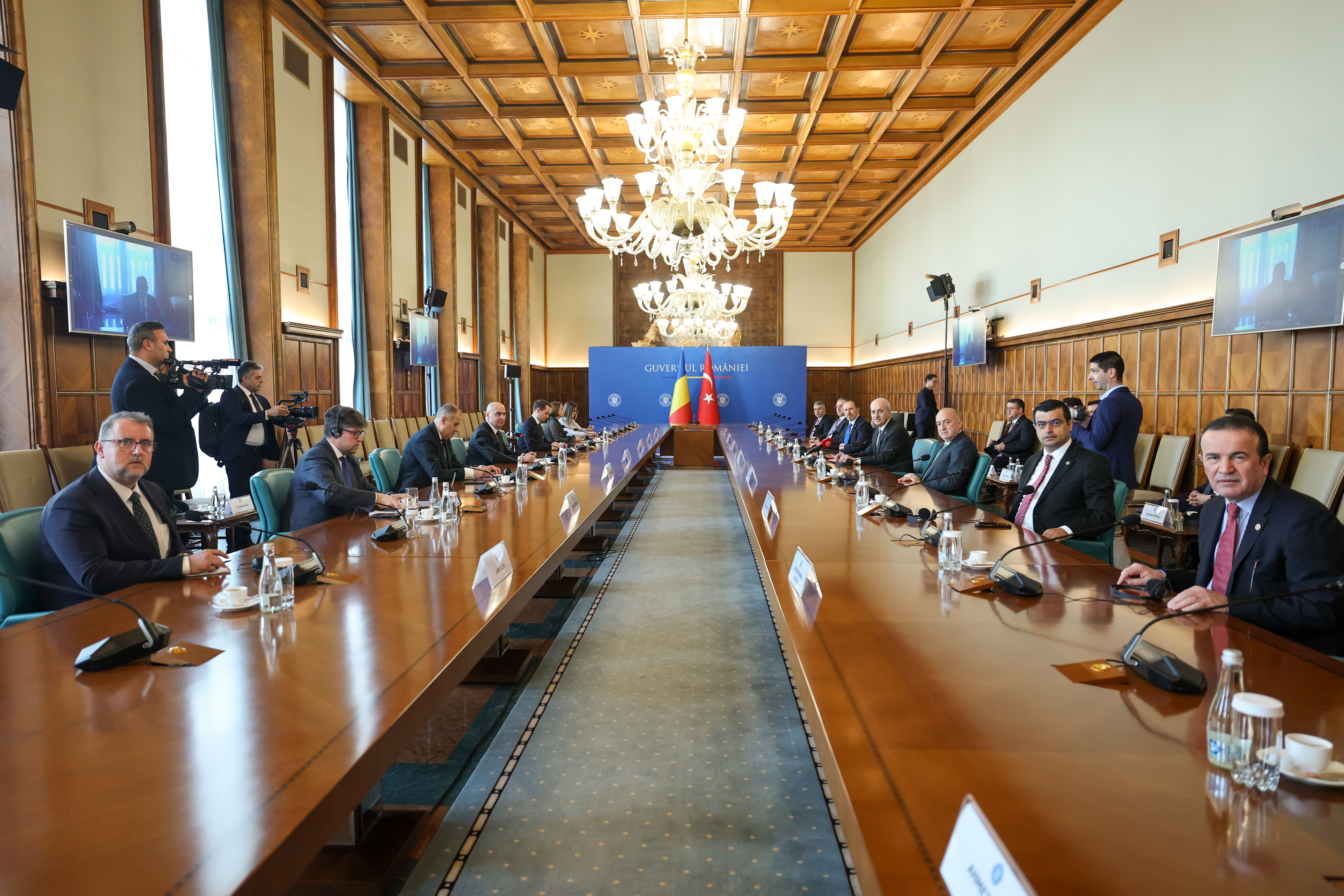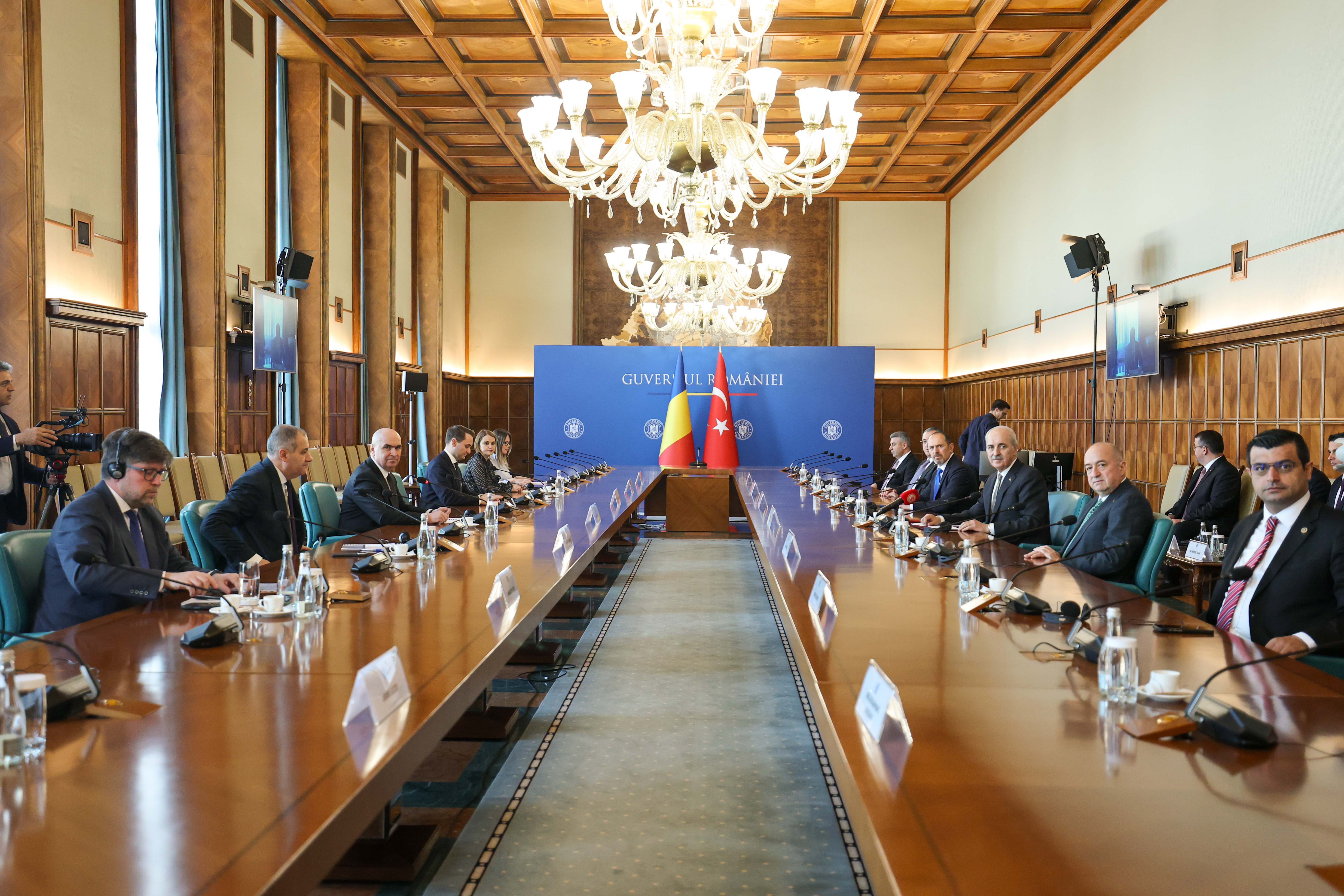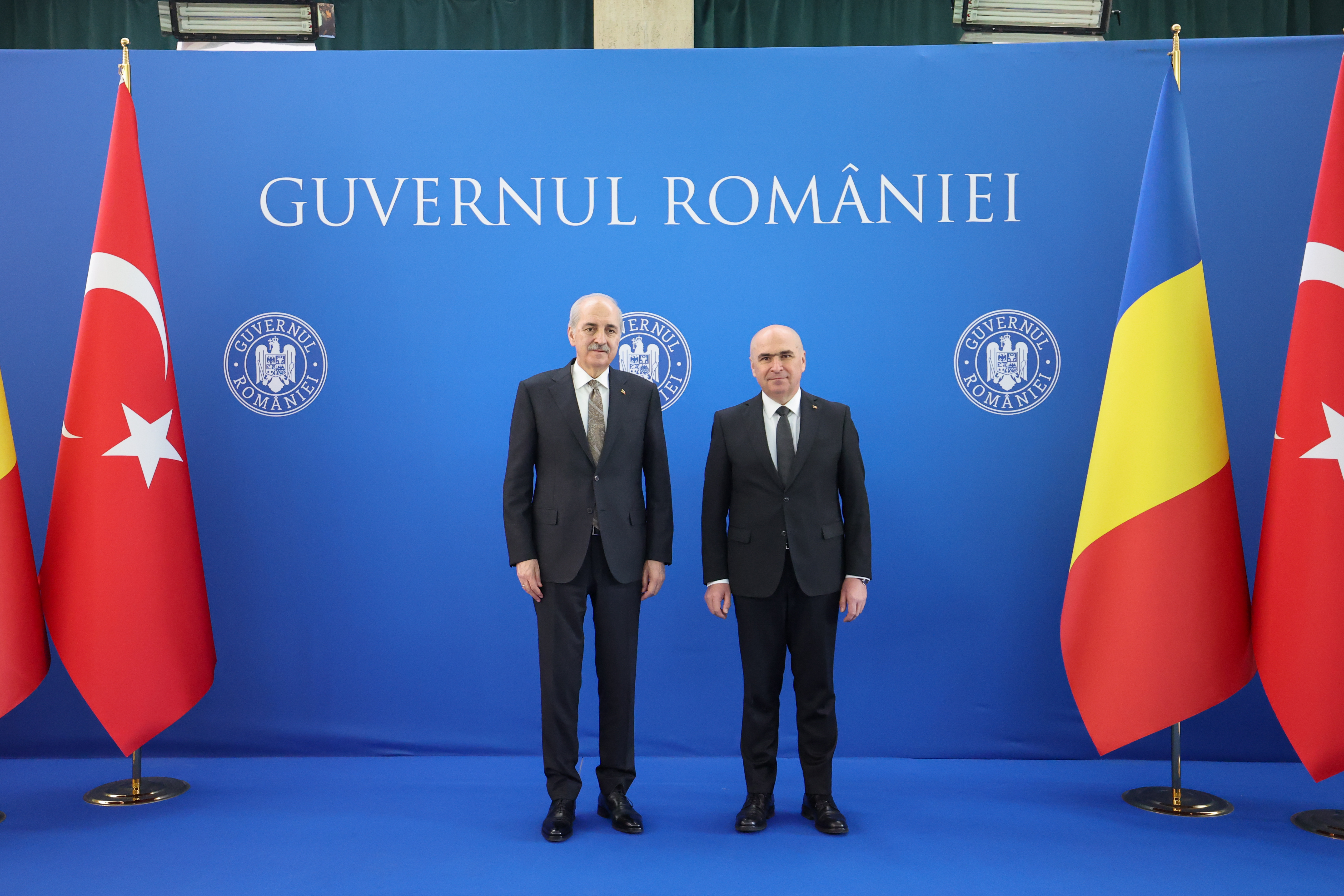TBMM Başkanı Kurtulmuş, Başbakanlık binasına gelişinde Bolojan tarafından karşılanarak Türkiye ve Romanya bayrakları önünde gazetecilere görüntü verdi.