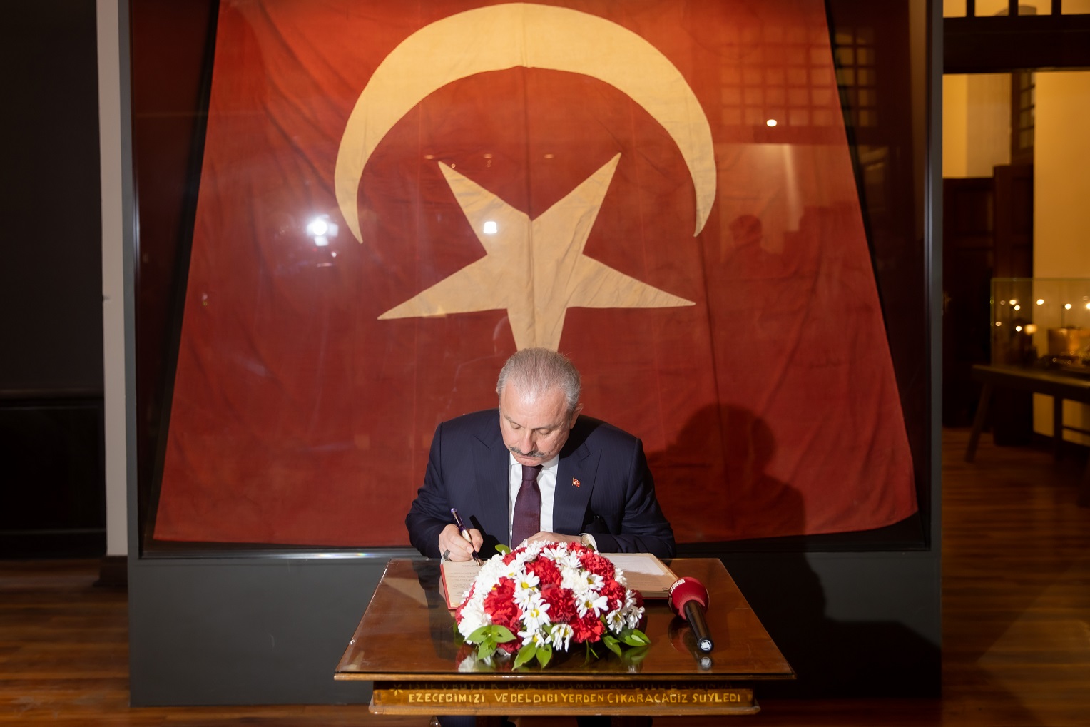 Konuşmasının ardından Meclis Özel Defteri'ni imzalayan Şentop, 100 yıl önce asılan, bugün de camekanda sergilenen Türk bayrağı önünde beraberindekilerle fotoğraf çektirdi.