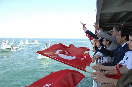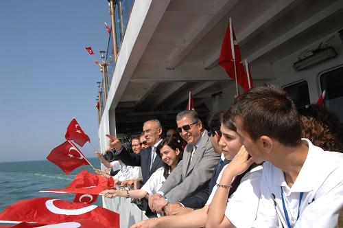Samsun Limanı'na gelişinde gemidekiler, Vali Yardımcısı Mehmet Mızrak ve Garnizon Komutanı Tuğgeneral Mehmet Ali Yıldırım ile AK Parti Samsun