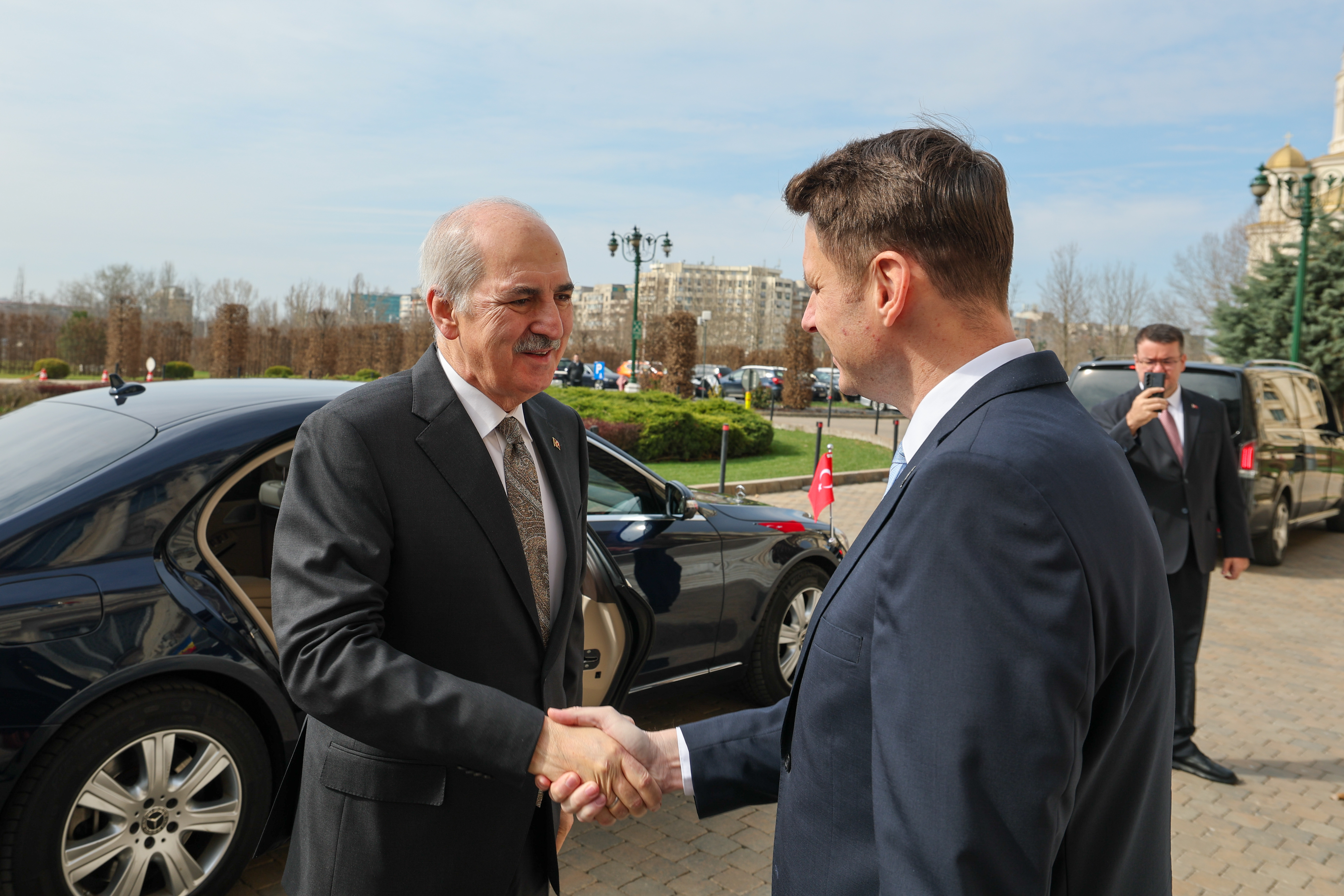 TBMM Başkanı Kurtulmuş, Romanya Parlamentosu binasına gelişinde Senato Başkanı Abrudean tarafından resmi törenle karşılandı.