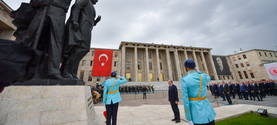 Törende, TBMM Başkanı. Mustafa Şentop'un Atatürk Anıtı'na kırmızı ve beyaz karanfillerden oluşan çelenk bırakmasının ardından saygı duruşunda bulunuldu, İstiklal Marşı okundu.