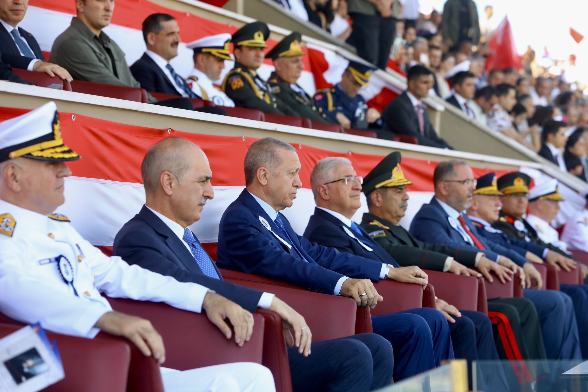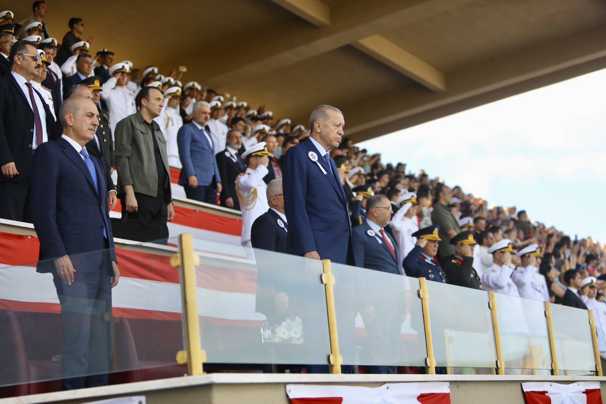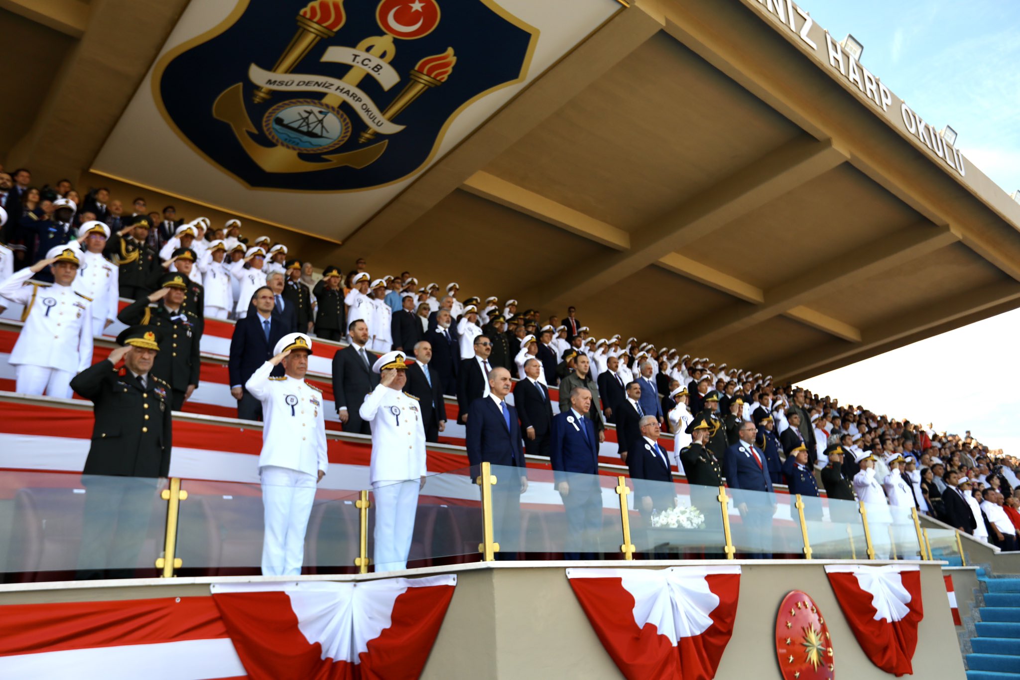 "Anneler, babalar özellikle sizlere sesleniyorum. Bu güzide evlatlarınızı sizler bizlere emanet ettiniz. Komutanlarımız, hocalarımız en güzel şekilde sizlerin bu emanetine sahip çıktılar. Onları bugüne hazırladılar. Bundan sonra teğmenlerimizle, üsteğmen, yüzbaşı, yarbay, binbaşı vesaire bu şekilde gurur duyacaksınız. O günleri göreceksiniz. Sizin bu gösterdiğiniz teveccühe, ilgiye bizler de gerek şahsım Başkomutan ve tüm devlet yönetimi olarak teşekkür ediyorum. Rabbim yar ve yardımcınız olsun diyorum. Rabbim sizleri her türlü kazadan, beladan ve saldırıdan muhafaza eylesin. Denizleriniz sakin, pruvanız neta, bahtınız hep açık olsun. Bu duygularla bir kez daha Deniz Harp Okulumuzun öğrencilerini, ailelerini, üniversitemizin yönetimini ve hocalarını tebrik ediyorum. Teğmenlerimize önlerindeki uzun görev sürelerinde başarılar diliyorum. Dost ülkelere gidecek teğmenlerimizin oralardaki kardeşlerimize en kalbi selam ve muhabbetlerimizi iletmelerini istiyorum. Hepinizi sevgiyle, saygıyla selamlıyorum. Kalın sağlıcakla."