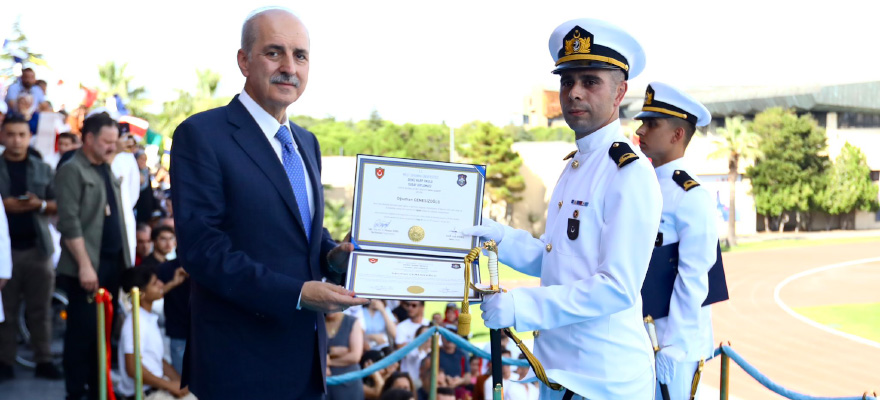 TBMM Başkanı Kurtulmuş törende, Deniz Harp Okulu’nu ikincilikle bitiren Teğmen Oğuzhan Çenesizoğlu’na diplomasını takdim etti.