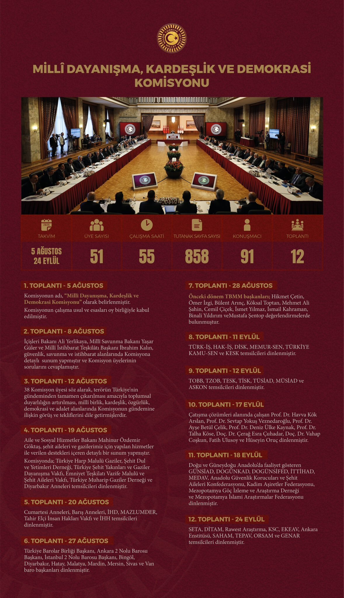 “Terörsüz Türkiye” hedefi doğrultusunda TBMM'de kurulan Millî Dayanışma, Kardeşlik ve Demokrasi Komisyonu’nun Ağustos ve Eylül aylarında gerçekleştirdiği toplantılarında, toplumun farklı kesimlerinden 91 konuşmacı görüş ve önerilerini paylaştı.