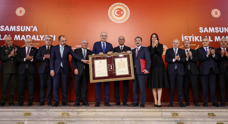 “İstiklal ateşinin yakıldığı en önemli merkezlerden biri olan Samsun’a, Millî Mücadele’de ortaya koyduğu tarihi kararlılığı, cesareti ve özverisi dolayısıyla Gazi Meclisimizde gerçekleştirdiğimiz törenle İstiklal Madalyası'nı ve beratını takdim ettik.