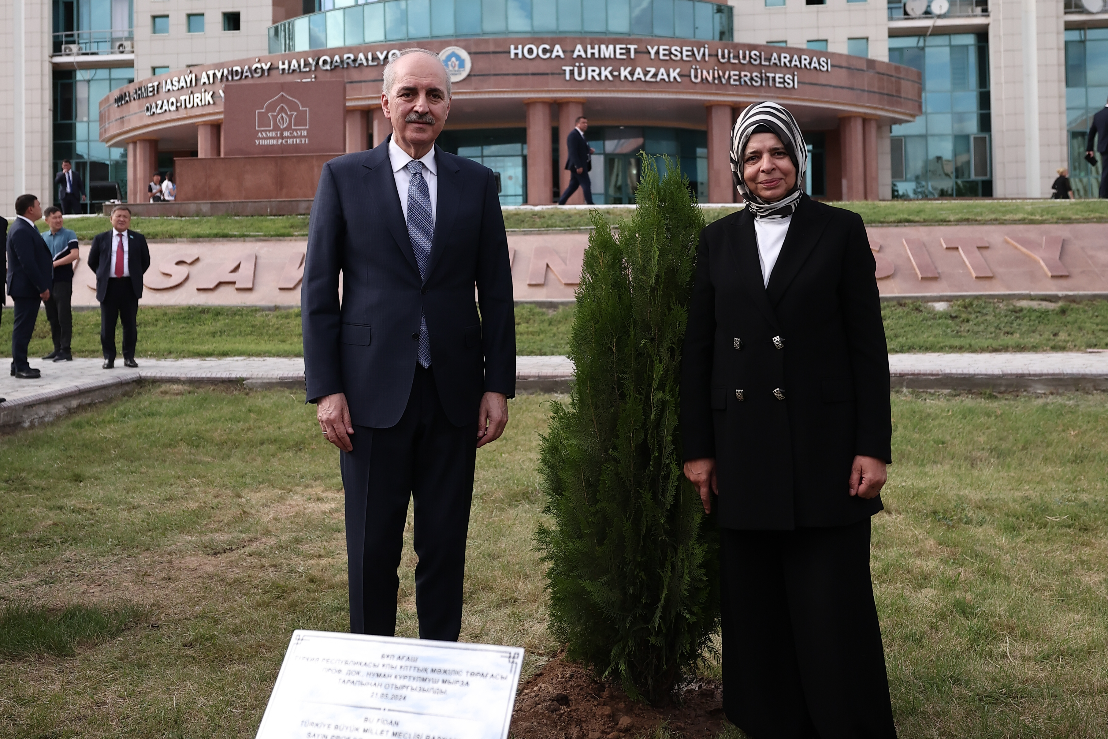 Konferans sonrası Hoca Ahmet Yesevi Uluslararası Türk-Kazak Üniversitesi Mütevelli Heyeti Başkanı Muhittin Şimşek ve rektör Dr. Janar Temirbekova, TBMM Başkanı Kurtulmuş’a geleneksel kazak giysisi Şapan giydirerek hediye takdim etti.