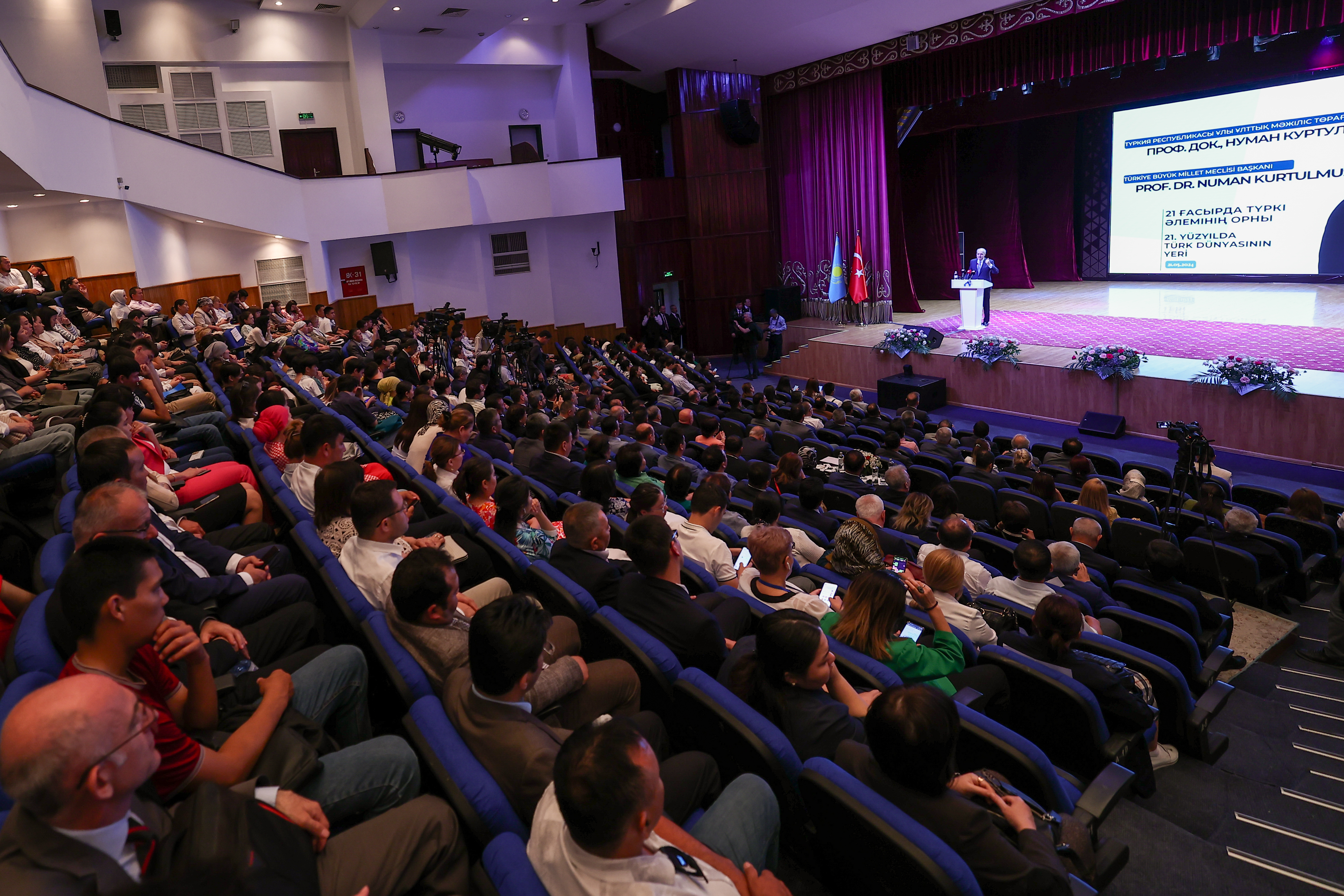Kazakistan Meclisi Başkanı Yerlan Koşanov ile üniversite bünyesindeki Türk Dünyası Tarihi Panoramik Müzesi’nde incelemede bulunan Kurtulmuş, “21. Yüzyılda Türk Dünyasının Yeri” konferansında katılımcılara hitap etti.
